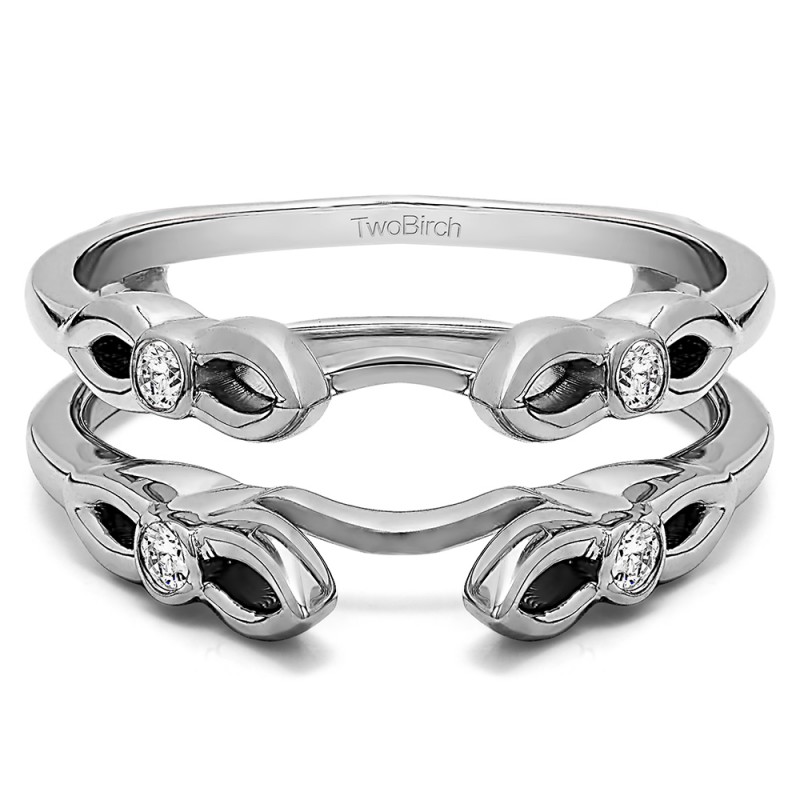 This wedding ring guard has 4 round, channel set stones. Each band measures 2 millimeters wide. This ring guard has 0.2 carats total weight.