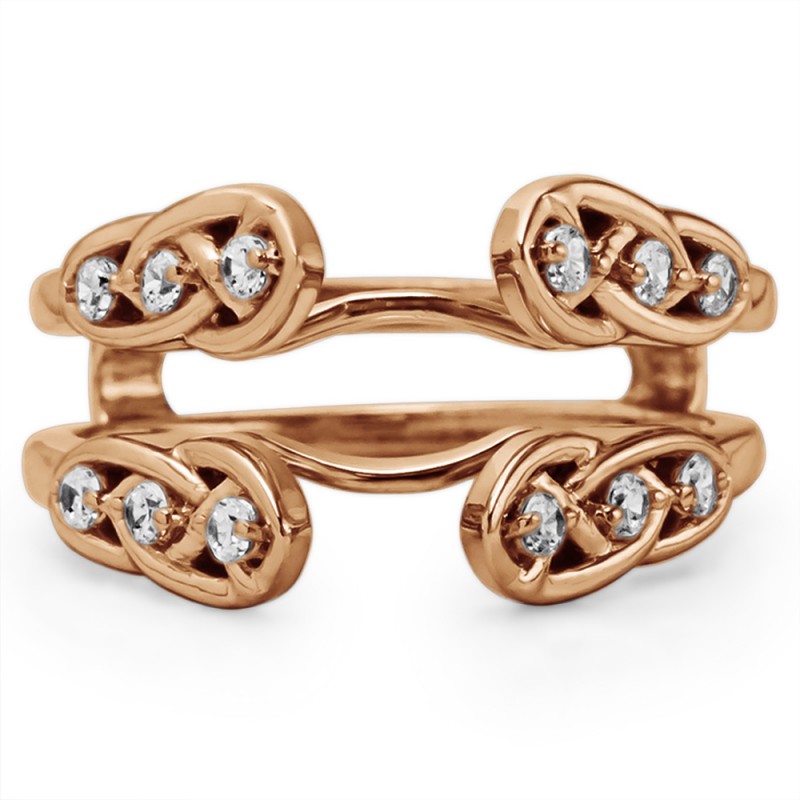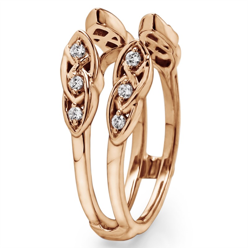 This wedding ring guard has 12 round, channel set stones. Each band measures 2 millimeters wide. This ring guard has 0.24 carats total weight.