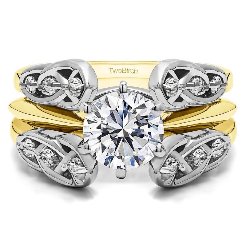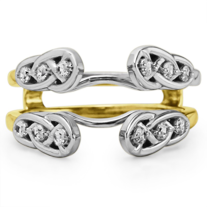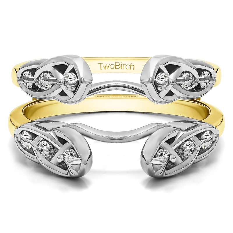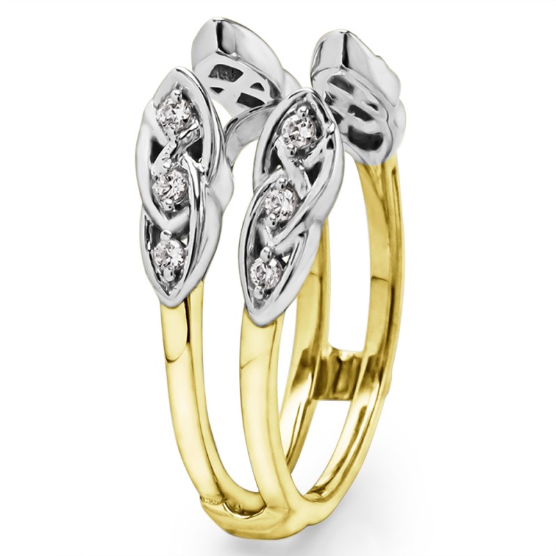 This wedding ring guard has 12 round, channel set stones. Each band measures 2 millimeters wide. This ring guard has 0.24 carats total weight.