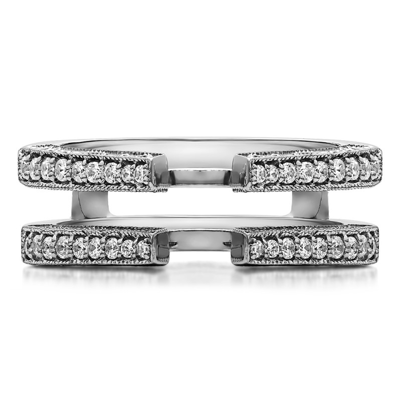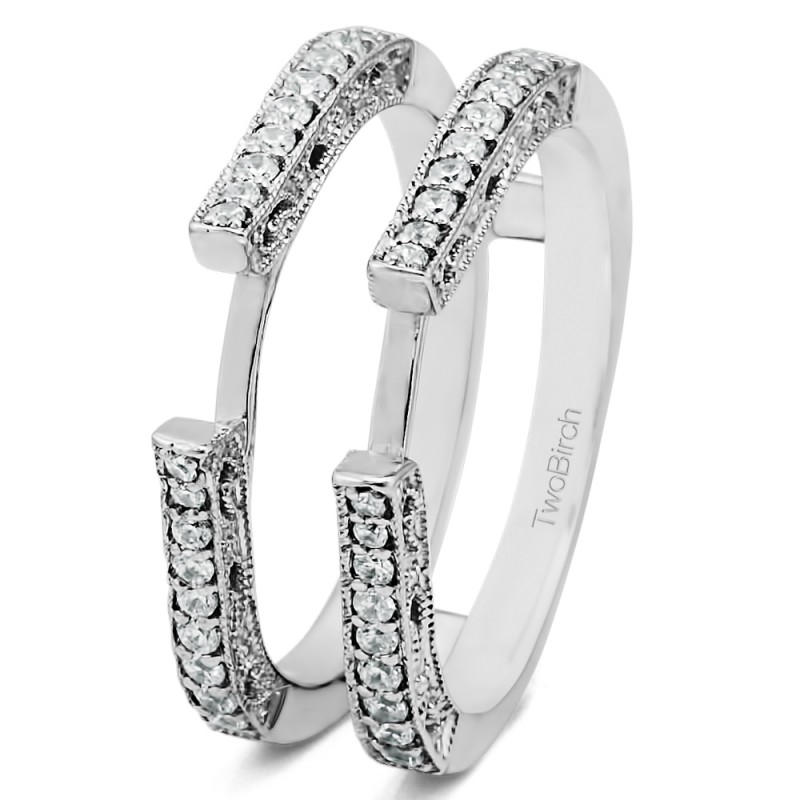 This wedding ring guard has 36 round, channel set stones. Each band measures 2 millimeters wide. This ring guard has 0.29 carats total weight. It is made to fit a round solitaire from 0.75 carats to 1.5, or a princess cut solitaire from 1 up to 2, or a marquise solitaire from 0.5 up to 1 carats.