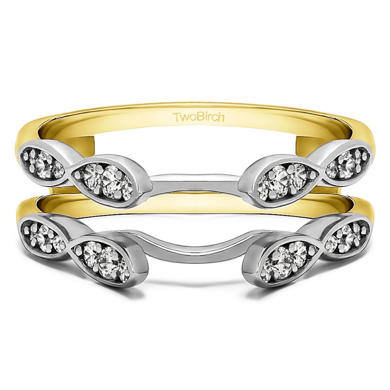 This wedding ring guard has 24 round, channel set stones. Each band measures 2 millimeters wide. This ring guard has 0.32 carats total weight.