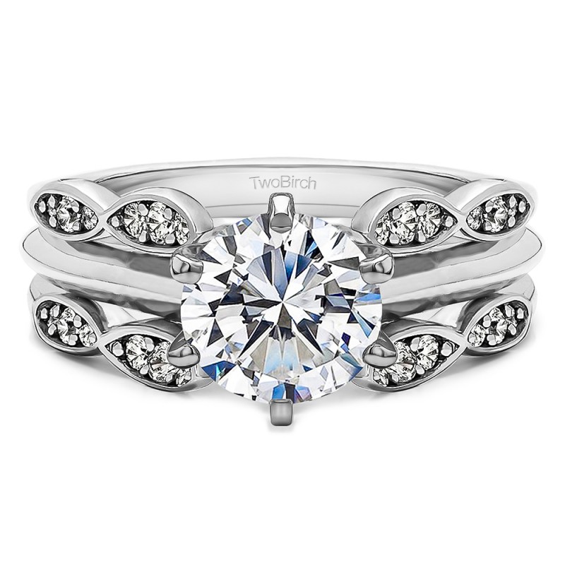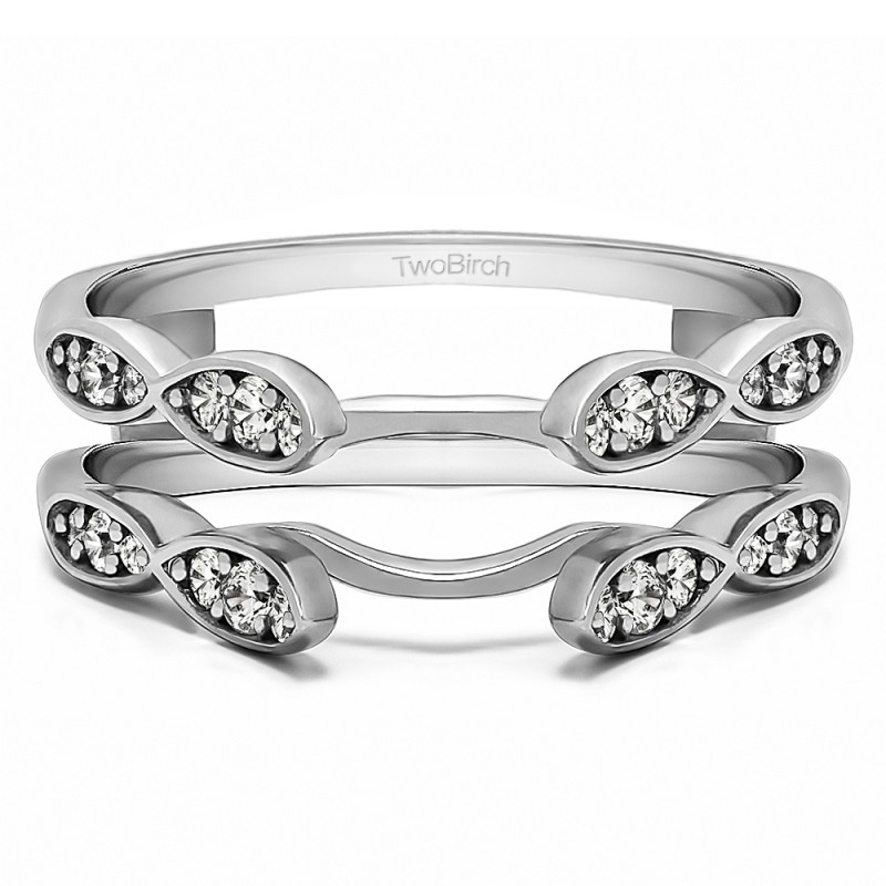 This wedding ring guard has 24 round, channel set stones. Each band measures 2 millimeters wide. This ring guard has 0.32 carats total weight.