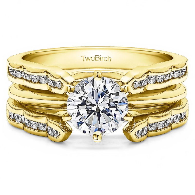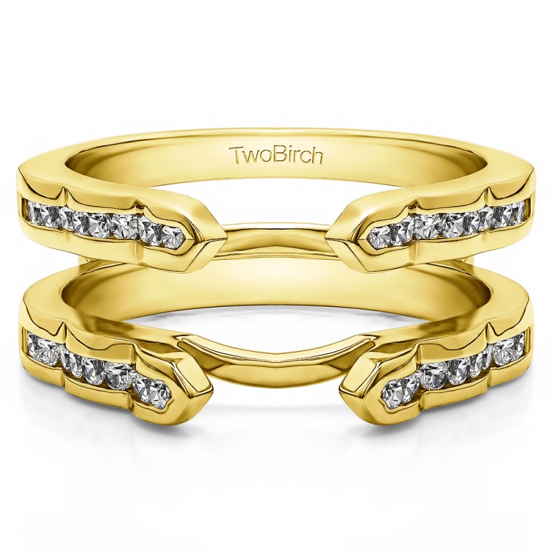 This wedding ring guard has 40 round, channel set stones. Each band measures 2 millimeters wide. This ring guard has 0.4 carats total weight. It is made to fit a round or marquise cut solitaire from 0.5 carats to 2, or a princess cut solitaire from 0.75 up to 2 carats.