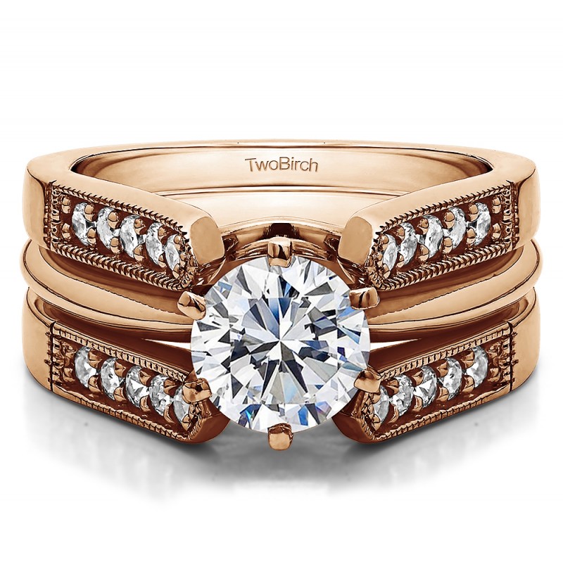 This wedding ring guard has 20 round, channel set stones. Each band measures 2.1 millimeters wide. This ring guard has 0.4 carats total weight. It is made to fit a round, marquise, or princess cut solitaire from 0.75 carats to 2 carats.