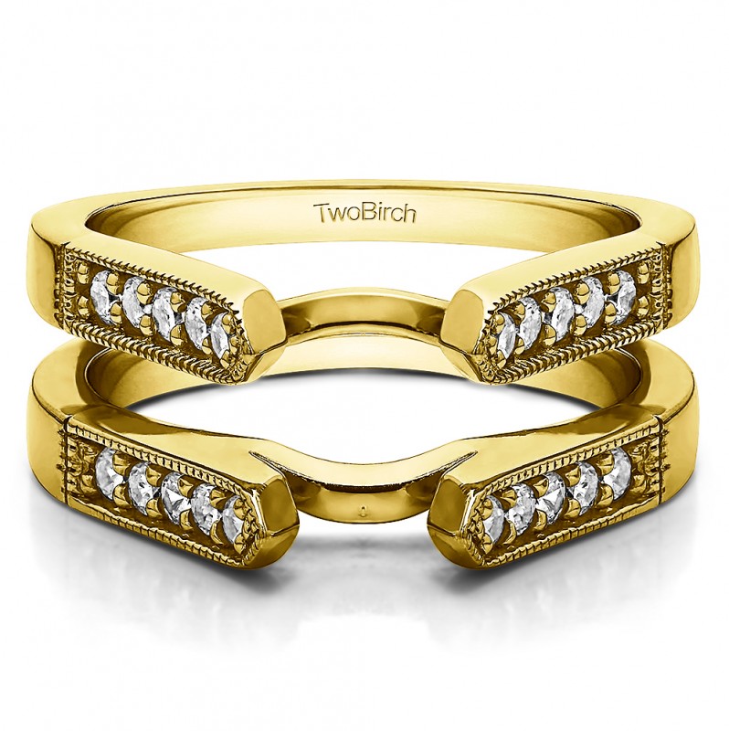 This wedding ring guard has 20 round, channel set stones. Each band measures 2.1 millimeters wide. This ring guard has 0.4 carats total weight. It is made to fit a round, marquise, or princess cut solitaire from 0.75 carats to 2 carats.