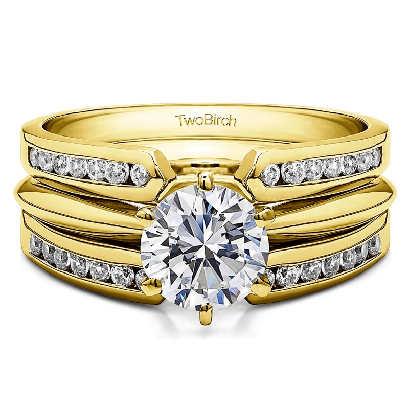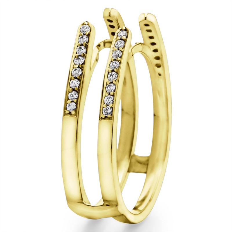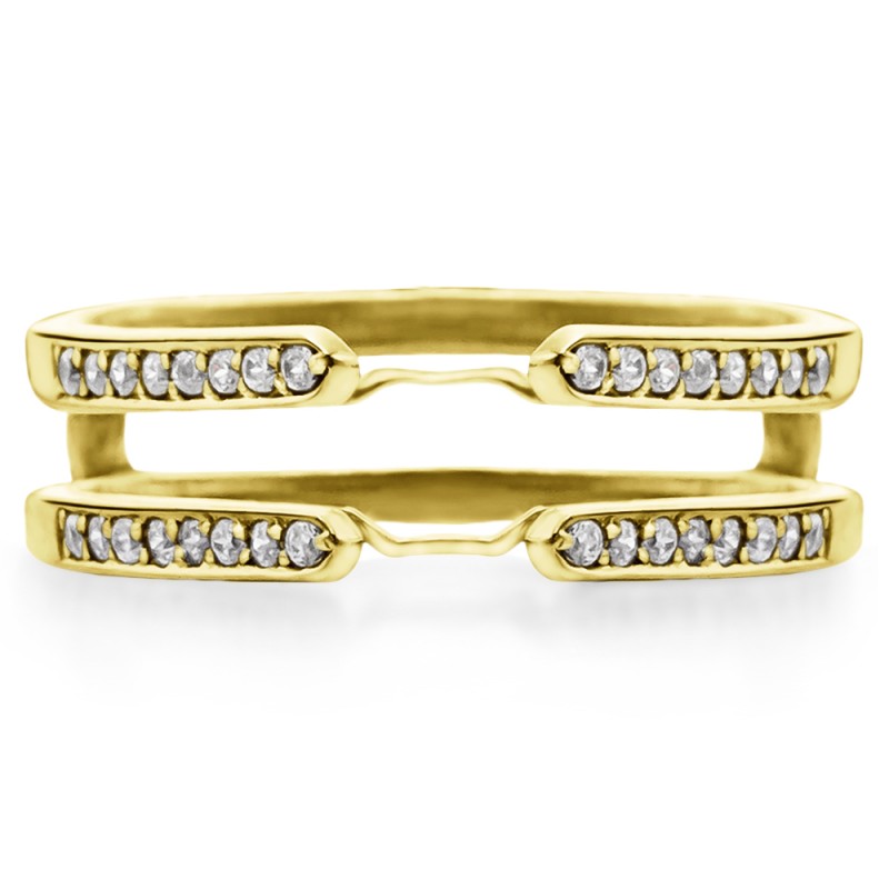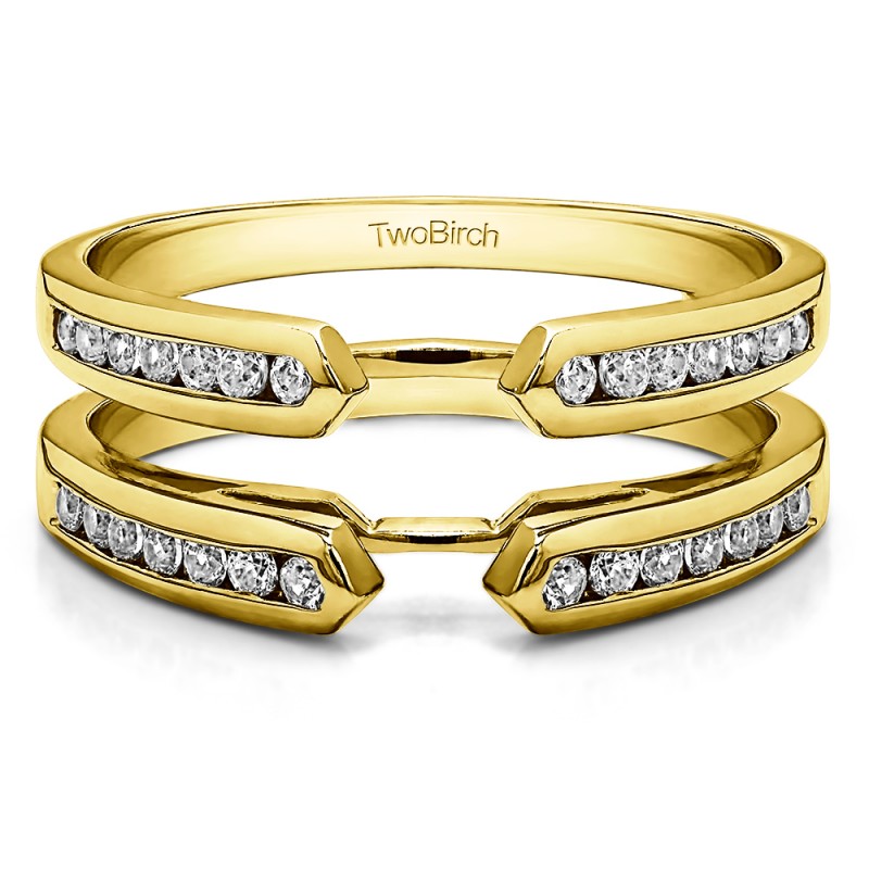 This wedding ring guard has 28 round, channel set stones. Each band measures 2 millimeters wide. This ring guard has 0.4 carats total weight. It is made to fit a round solitaire from 0.5 carats to 1.5, or a princess or marquise cut solitaire from 0.5 up to 1 carats.