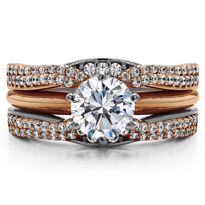 This wedding ring guard has 94 round, prong set stones. Each band measures 2.22 millimeters wide. This ring guard has 0.5 carats total weight. It is made to fit a round solitaire from 0.5 carats to 1.5, or a princess cut solitaire from 0.5 up to 2, or a marquise solitaire from 0.75 up to 1.5 carats.