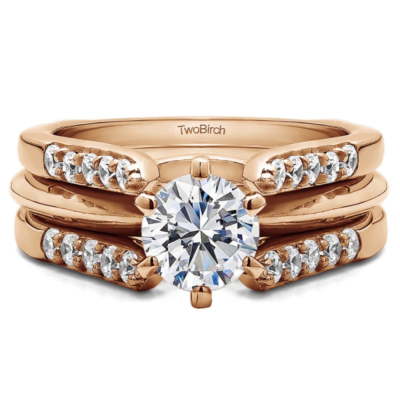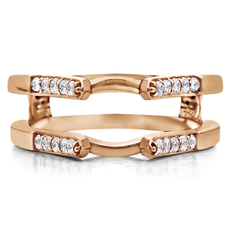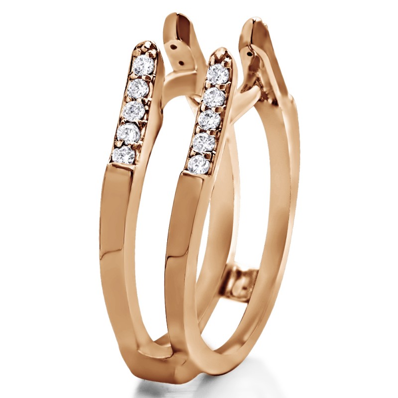 This wedding ring guard has 20 round, prong set stones. Each band measures 2 millimeters wide. This ring guard has 0.5 carats total weight. It is made to fit a round solitaire from 0.5 carats to 1, or a princess or marquise cut solitaire from .50 carats up to .75 carats.