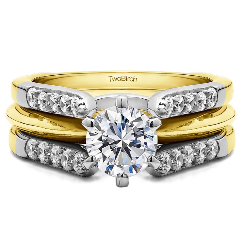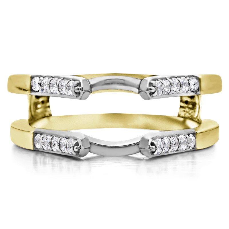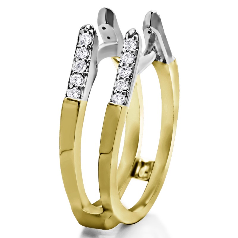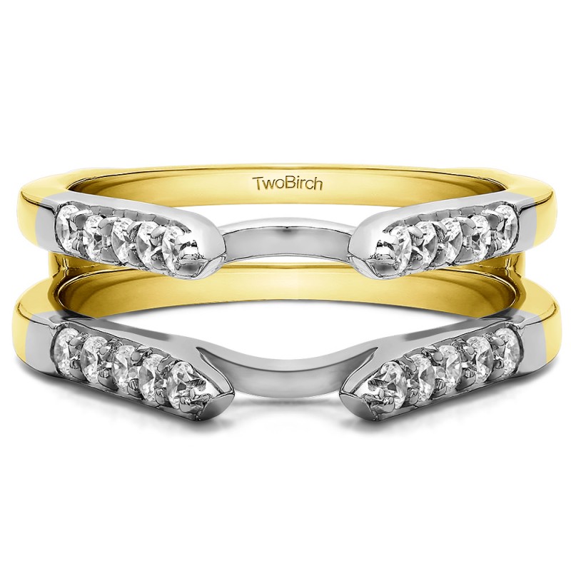 This wedding ring guard has 20 round, prong set stones. Each band measures 2 millimeters wide. This ring guard has 0.5 carats total weight. It is made to fit a round solitaire from 0.5 carats to 1, or a princess or marquise cut solitaire from .50 carats up to .75 carats.
