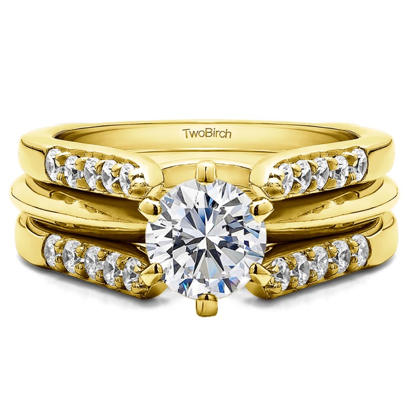 This wedding ring guard has 20 round, prong set stones. Each band measures 2 millimeters wide. This ring guard has 0.5 carats total weight. It is made to fit a round solitaire from 0.5 carats to 1, or a princess or marquise cut solitaire from .50 carats up to .75 carats.