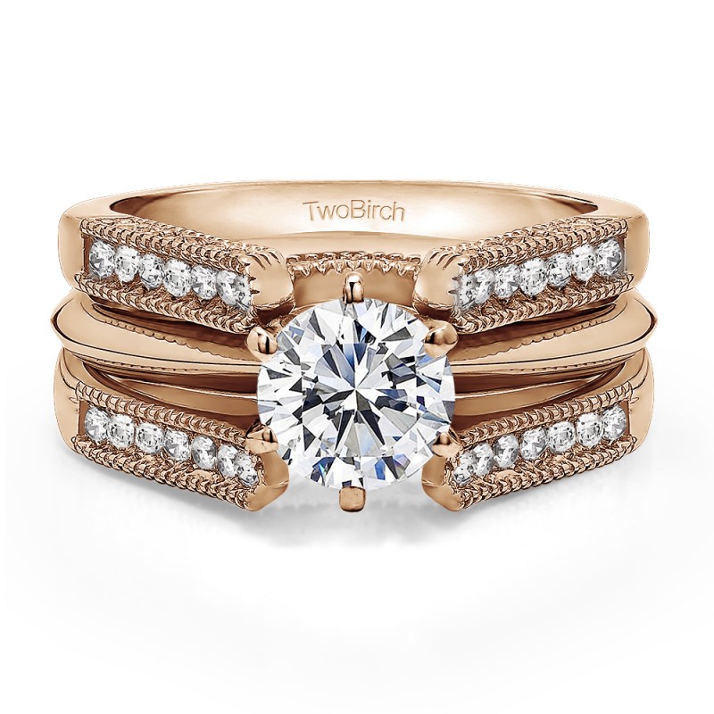 This wedding ring guard has 64 round, channel set stones. Each band measures 2 millimeters wide. This ring guard has 0.54 carats total weight.