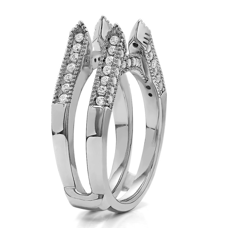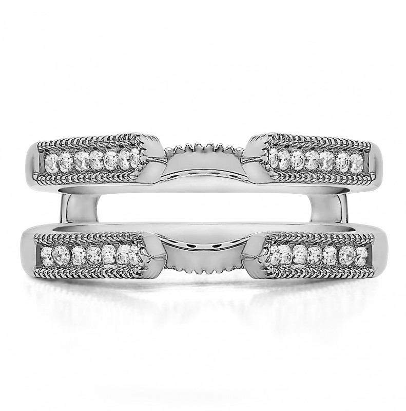 This wedding ring guard has 64 round, channel set stones. Each band measures 2 millimeters wide. This ring guard has 0.54 carats total weight.