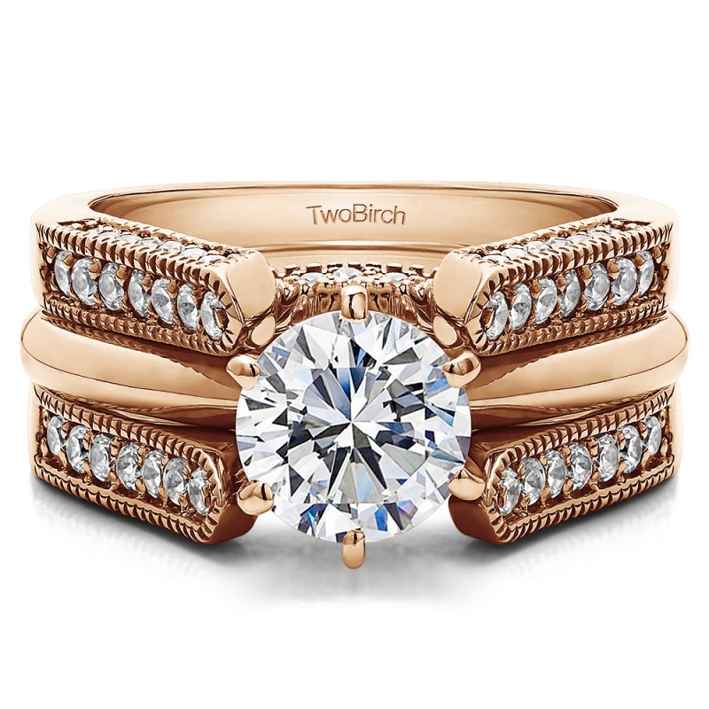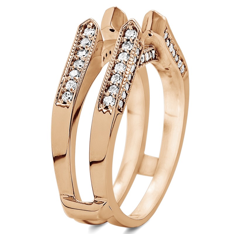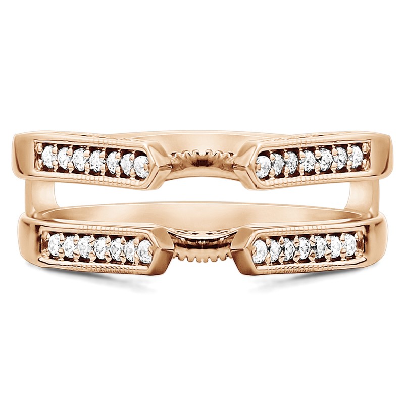 This wedding ring guard has 68 round, channel set stones. Each band measures 2 millimeters wide. This ring guard has 0.55 carats total weight. It is made to fit a round solitaire from 0.75 carats to 2, or a princess cut solitaire from 0.5 up to 2, or a marquise solitaire from 0.5 up to 1 carats.