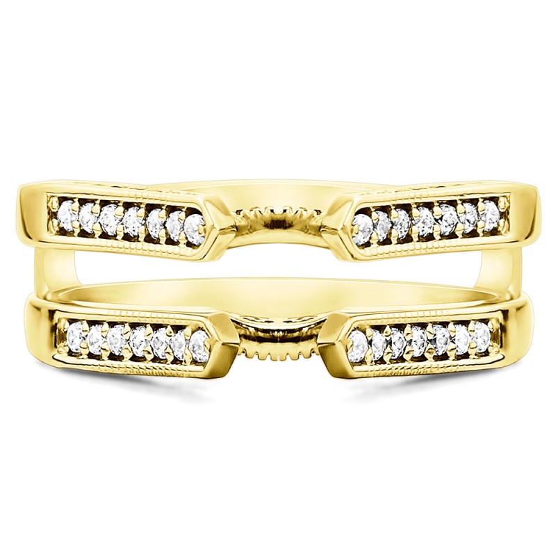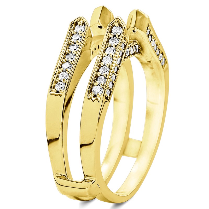 This wedding ring guard has 68 round, channel set stones. Each band measures 2 millimeters wide. This ring guard has 0.55 carats total weight. It is made to fit a round solitaire from 0.75 carats to 2, or a princess cut solitaire from 0.5 up to 2, or a marquise solitaire from 0.5 up to 1 carats.