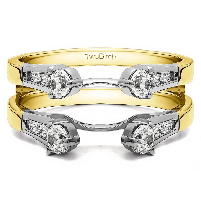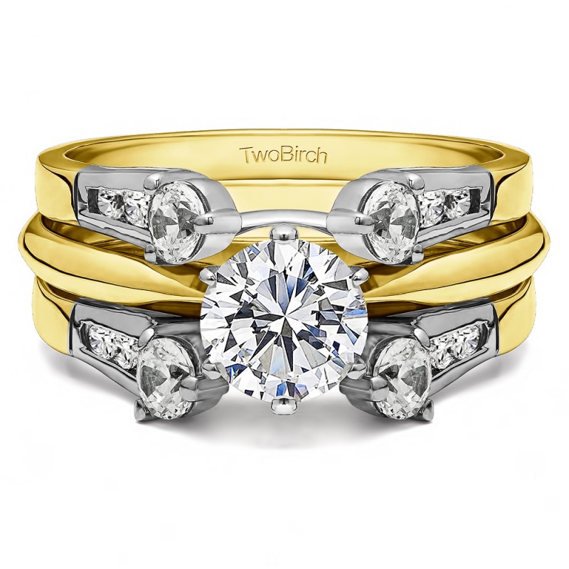 This wedding ring guard has 16 round, bar set stones. Each band measures 2 millimeters wide. This ring guard has 0.75 carats total weight. It is made to fit a round, marquise, or princess cut solitaire from 0.75 carats to 2 carats.