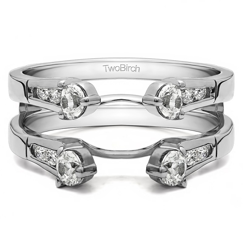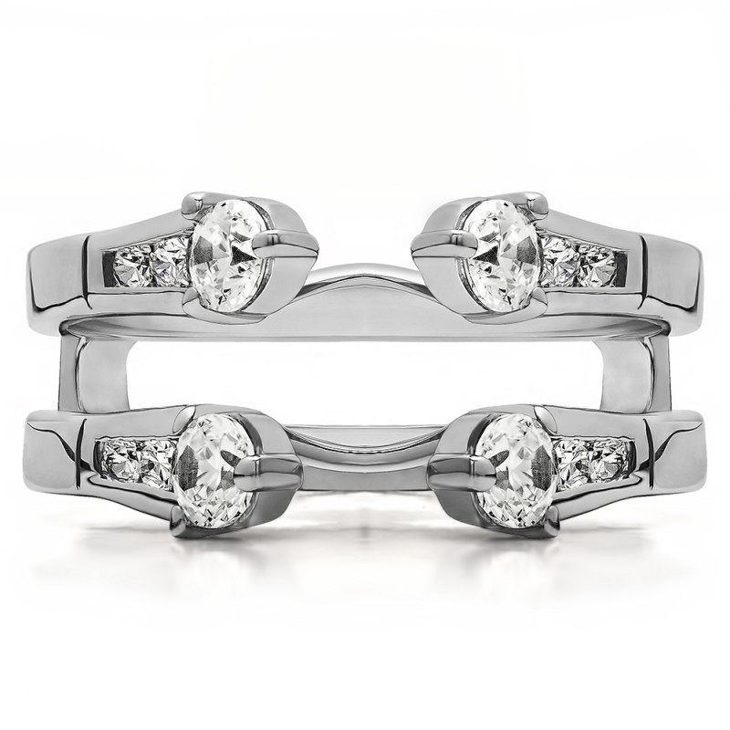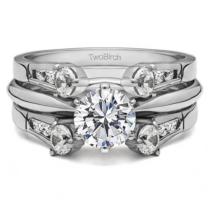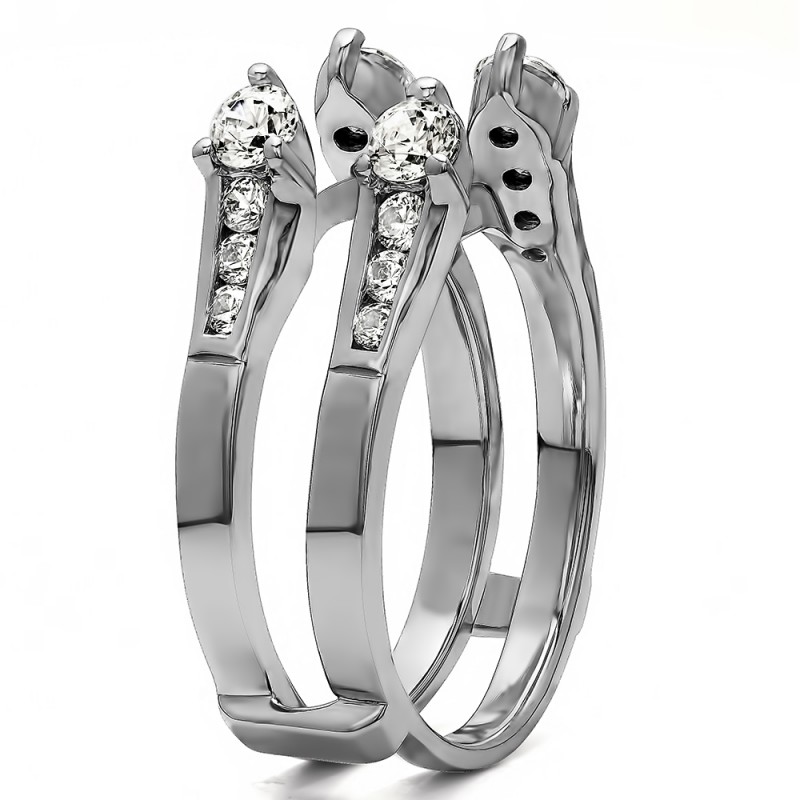 This wedding ring guard has 16 round, bar set stones. Each band measures 2 millimeters wide. This ring guard has 0.75 carats total weight. It is made to fit a round, marquise, or princess cut solitaire from 0.75 carats to 2 carats.