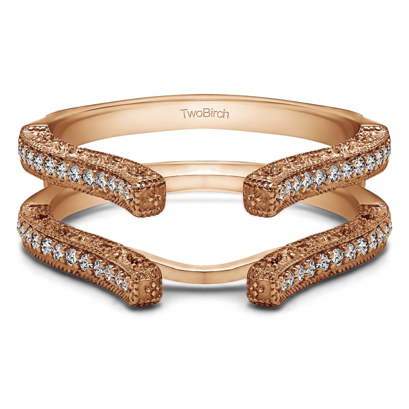 This wedding ring guard has 48 round, prong set stones. Each band measures 2.04 millimeters wide. This ring guard has 0.36 carats total weight. It is made to fit a round solitaire from 0.25 carats to 1.5, or a princess or marquise cut solitaire from 0.5 up to 1.5 carats.
