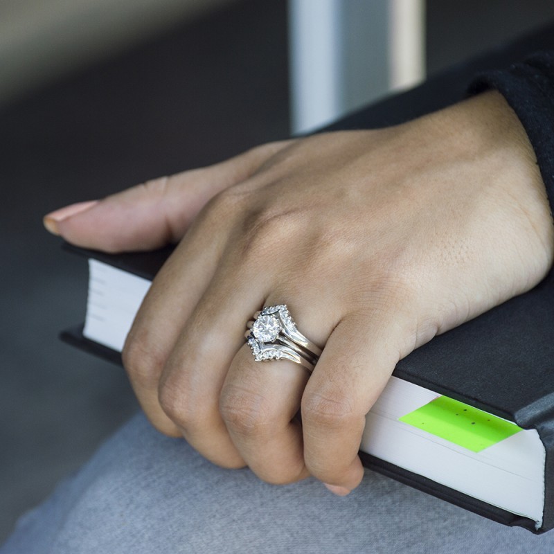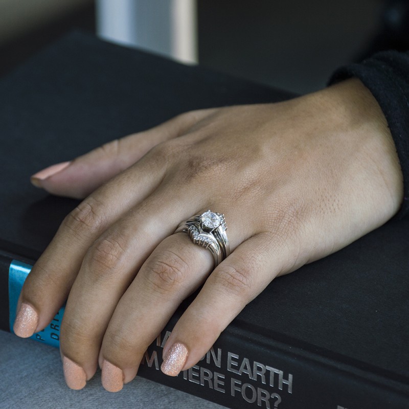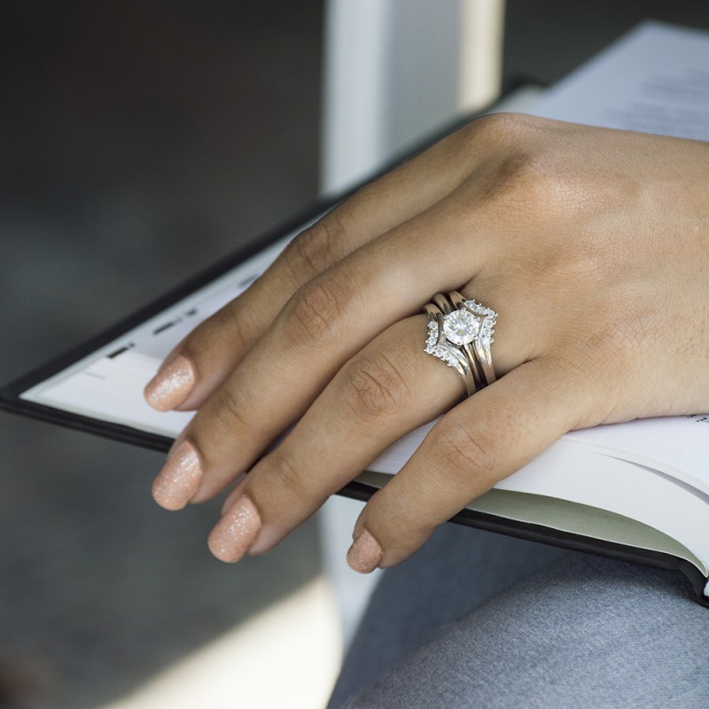 This wedding ring guard has 14 round, prong set stones. Each band measures 2.9 millimeters wide. This ring guard has 0.25 carats total weight. It is made to fit a round solitaire from 0.25 carats to 2, or a princess cut solitaire from 0.5 up to 1.5 carats.