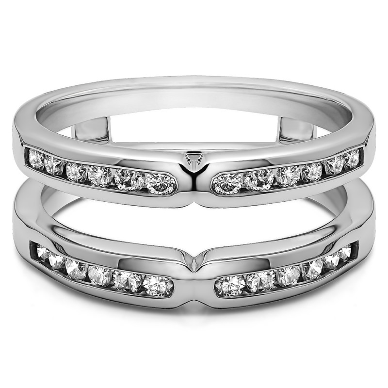 This wedding ring guard has 24 round, channel set stones. Each band measures 1.8 millimeters wide. This ring guard has 0.26 carats total weight. It is made to fit a round solitaire from 0.2 carats to 0.45, or a princess cut solitaire from 0.2 up to 0.75, or a marquise solitaire from 0.25 up to 0.5 carats.