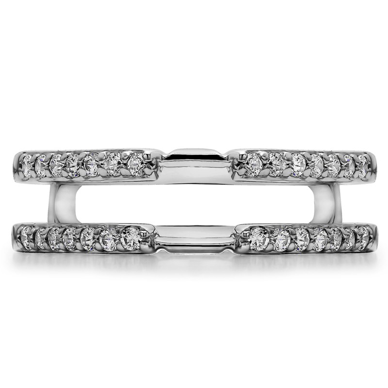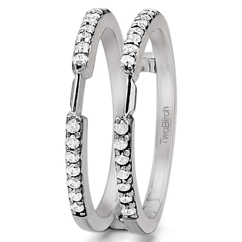 This wedding ring guard has 28 round, prong set stones. Each band measures 2 millimeters wide. This ring guard has 0.28 carats total weight. It is made to fit a round solitaire from 0.25 carats to 2, or a princess cut solitaire from 0.25 up to 1.5, or a marquise solitaire from 0.25 up to 1 carats.