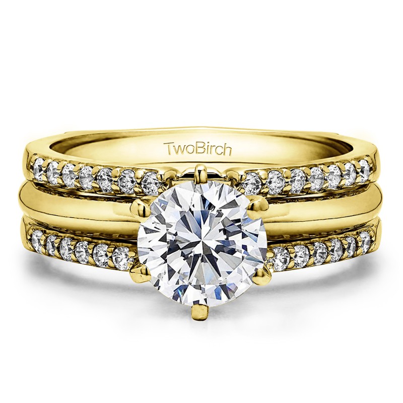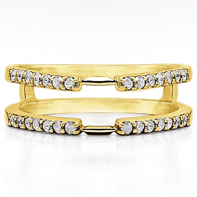 This wedding ring guard has 28 round, prong set stones. Each band measures 2 millimeters wide. This ring guard has 0.28 carats total weight. It is made to fit a round solitaire from 0.25 carats to 2, or a princess cut solitaire from 0.25 up to 1.5, or a marquise solitaire from 0.25 up to 1 carats.