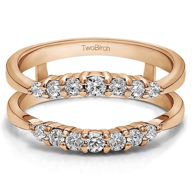 This wedding ring guard has 14 round, prong set stones. Each band measures 2 millimeters wide. This ring guard has 0.35 carats total weight.