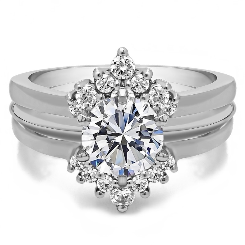 This wedding ring guard has 24 round, prong set stones. Each band measures 2.7 millimeters wide. This ring guard has 0.37 carats total weight. It is made to fit a round solitaire from 0.25 carats to 0.5, or a princess cut solitaire from 0.2 up to 0.2 carats.