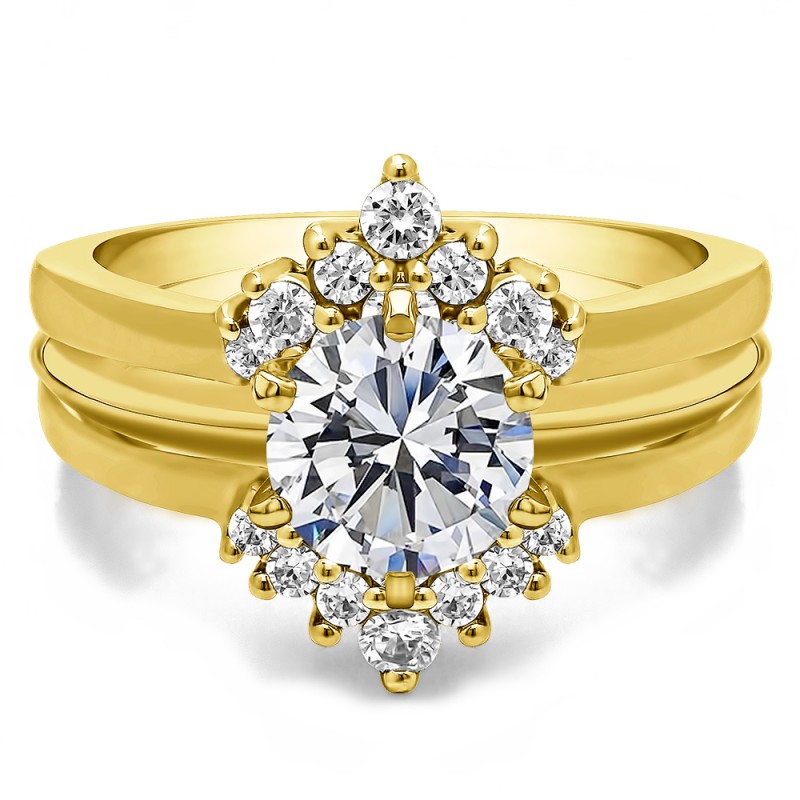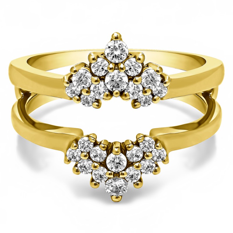 This wedding ring guard has 24 round, prong set stones. Each band measures 2.7 millimeters wide. This ring guard has 0.37 carats total weight. It is made to fit a round solitaire from 0.25 carats to 0.5, or a princess cut solitaire from 0.2 up to 0.2 carats.