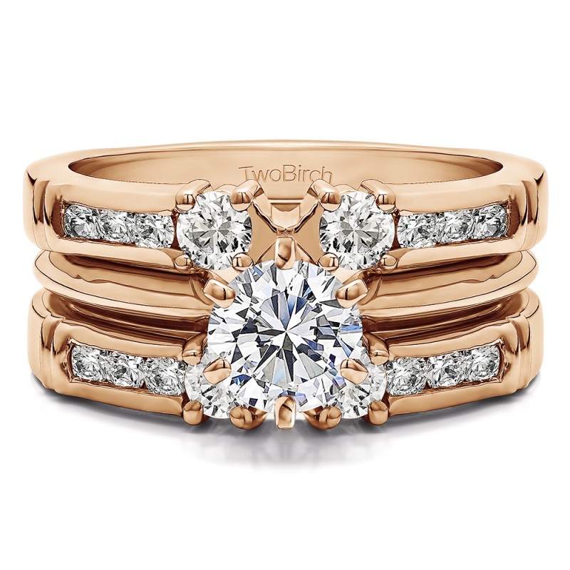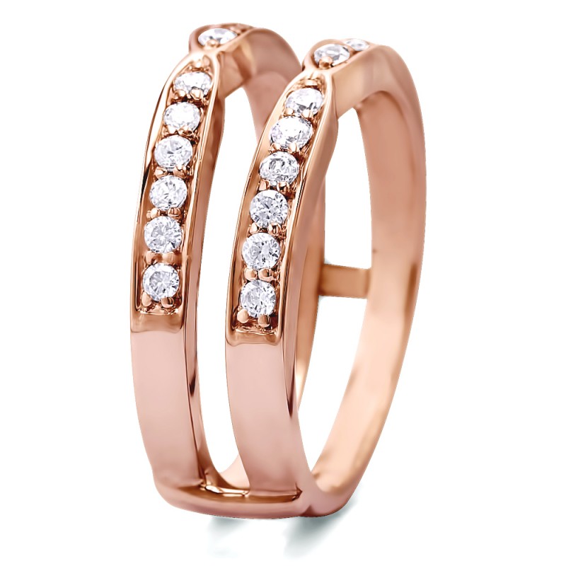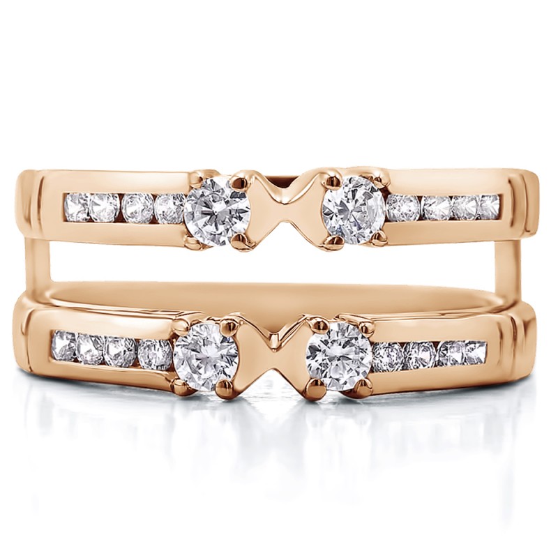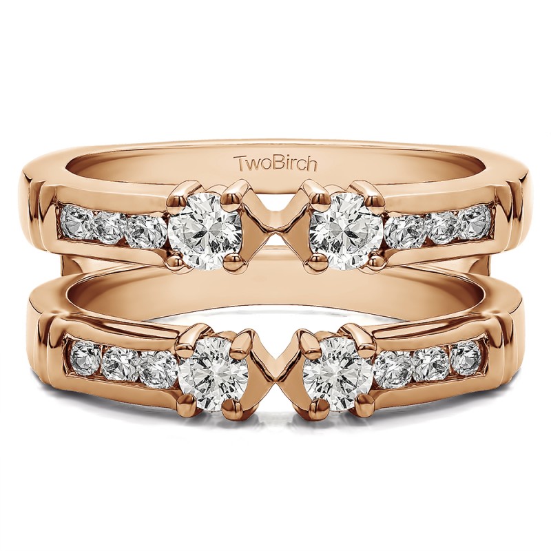 This wedding ring guard has 20 round, channel set stones. Each band measures 2.3 millimeters wide. This ring guard has 0.48 carats total weight. It is made to fit a round or princess cut solitaire from 0.25 carats to 2 carats.