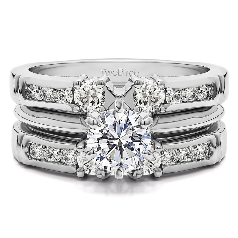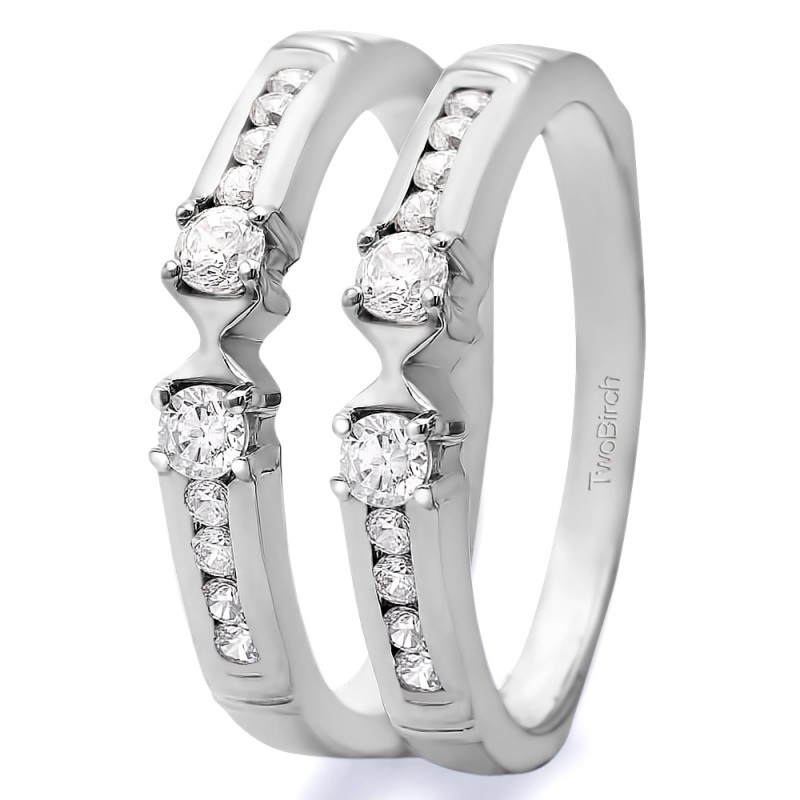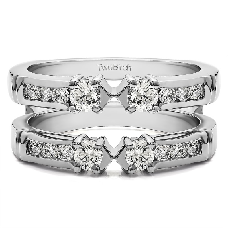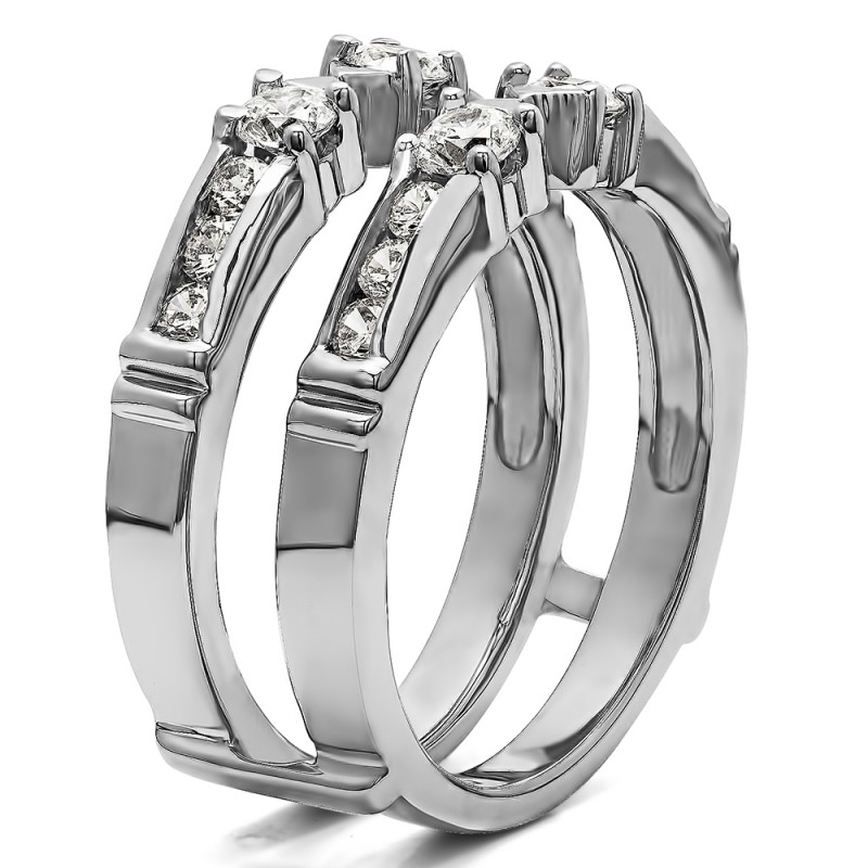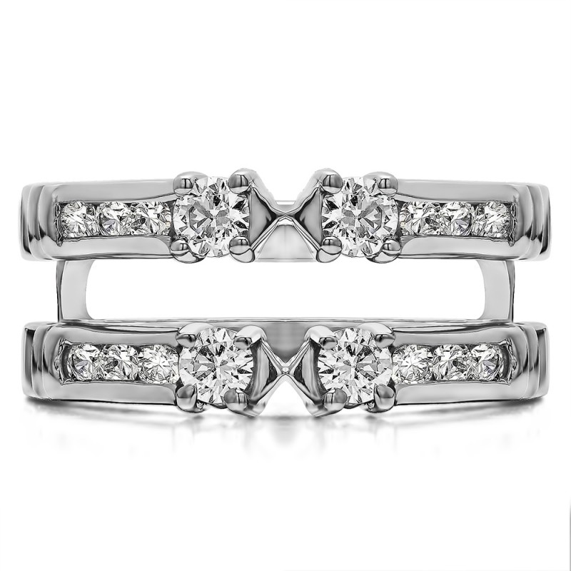 This wedding ring guard has 20 round, channel set stones. Each band measures 2.3 millimeters wide. This ring guard has 0.48 carats total weight. It is made to fit a round or princess cut solitaire from 0.25 carats to 2 carats.