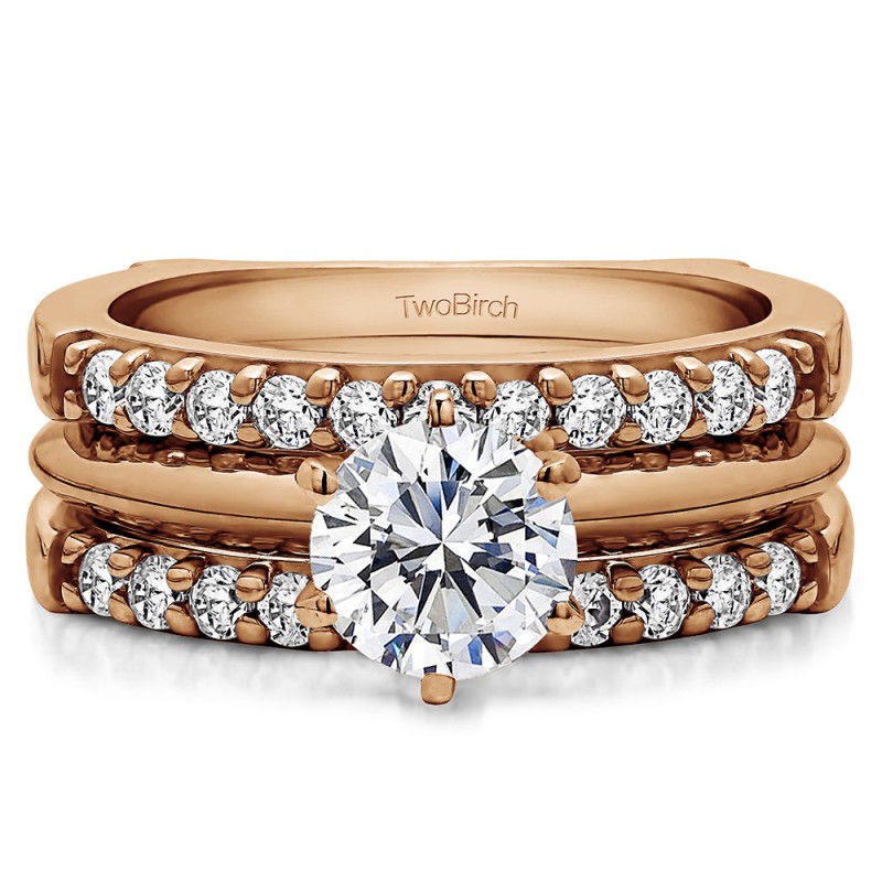 This wedding ring guard has 22 round, prong set stones. Each band measures 2.6 millimeters wide. This ring guard has 0.51 carats total weight. It is made to fit a round solitaire from 0.5 carats to 0.75, or a princess cut solitaire from 0.25 up to 0.5 carats.