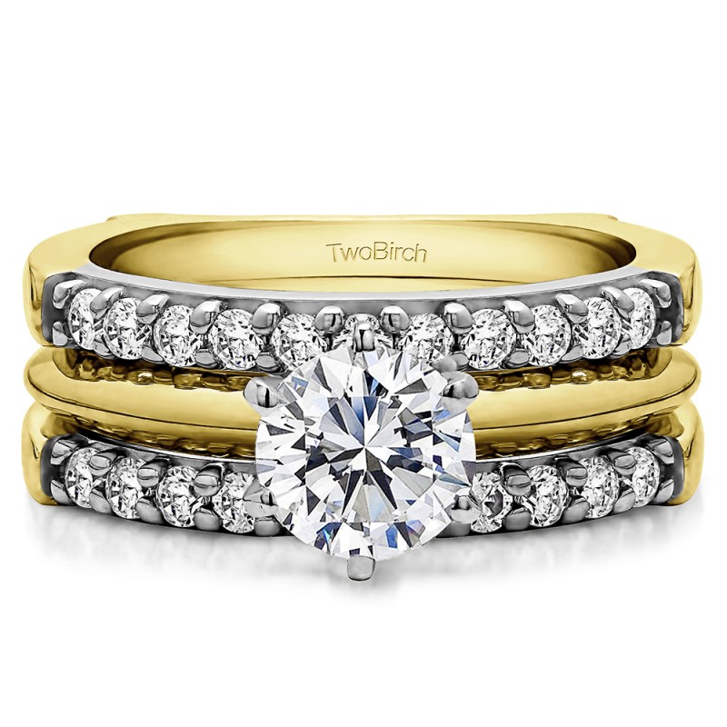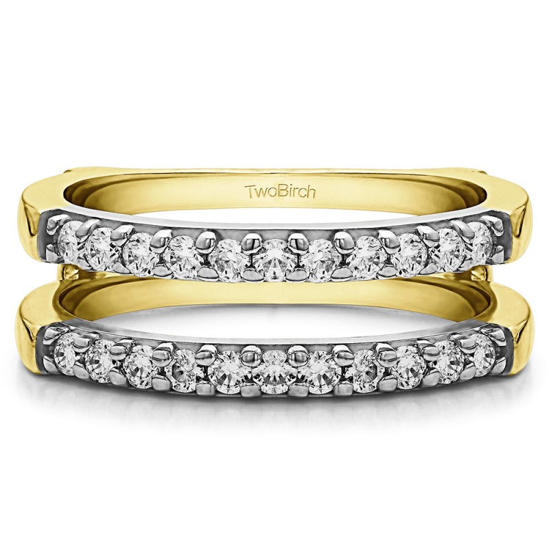 This wedding ring guard has 22 round, prong set stones. Each band measures 2.6 millimeters wide. This ring guard has 0.51 carats total weight. It is made to fit a round solitaire from 0.5 carats to 0.75, or a princess cut solitaire from 0.25 up to 0.5 carats.