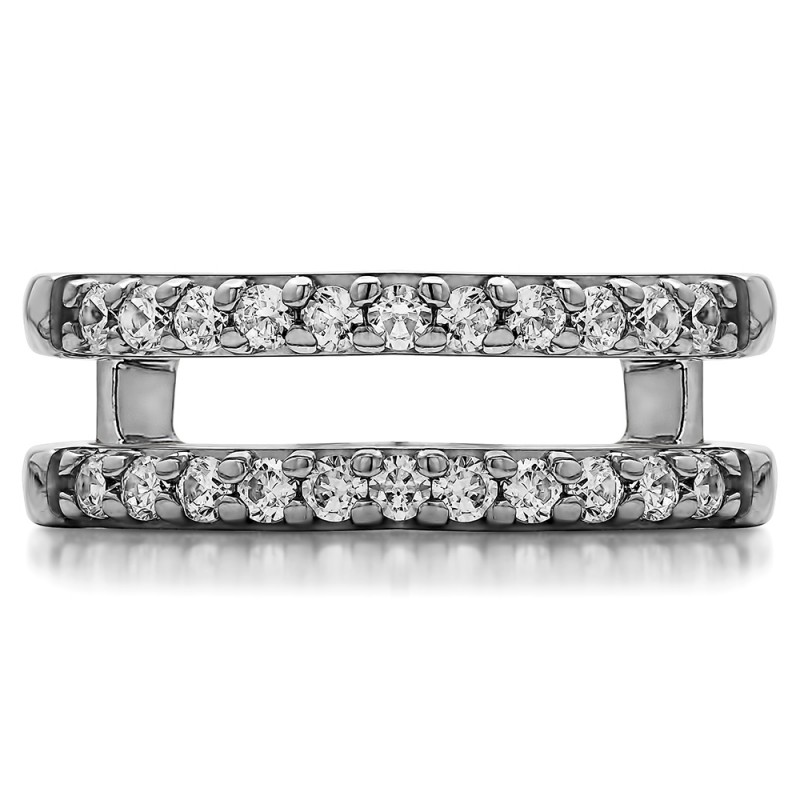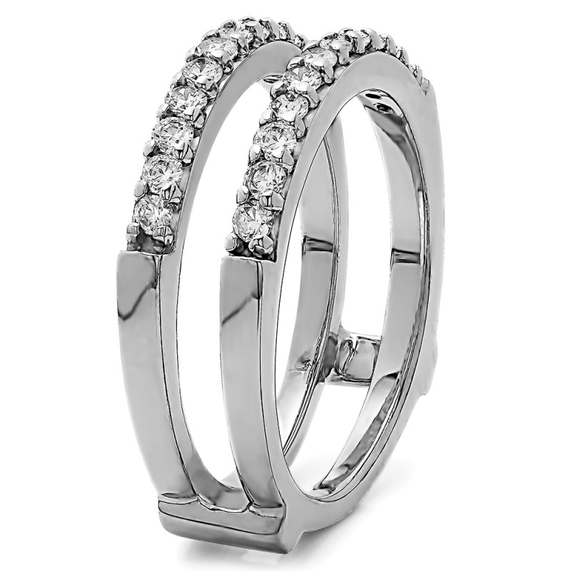 This wedding ring guard has 22 round, prong set stones. Each band measures 2.6 millimeters wide. This ring guard has 0.51 carats total weight. It is made to fit a round solitaire from 0.5 carats to 0.75, or a princess cut solitaire from 0.25 up to 0.5 carats.