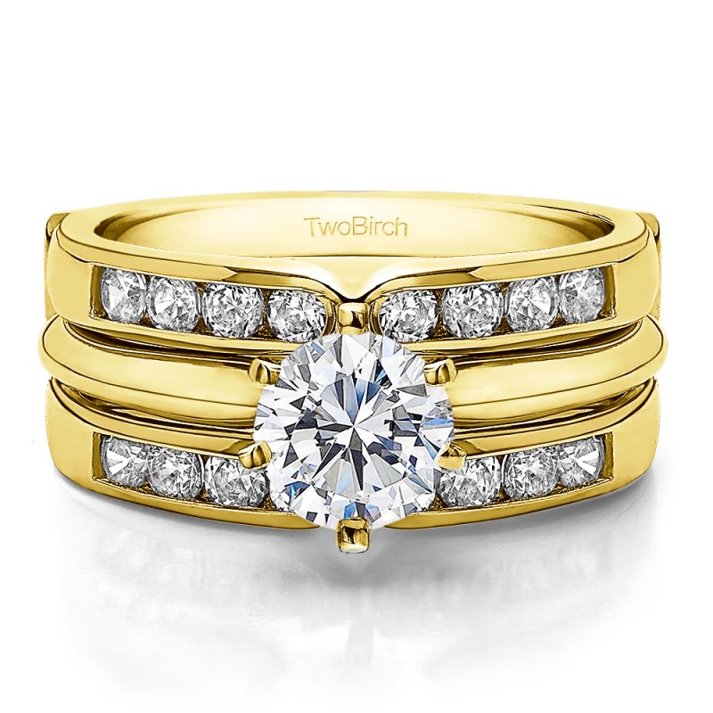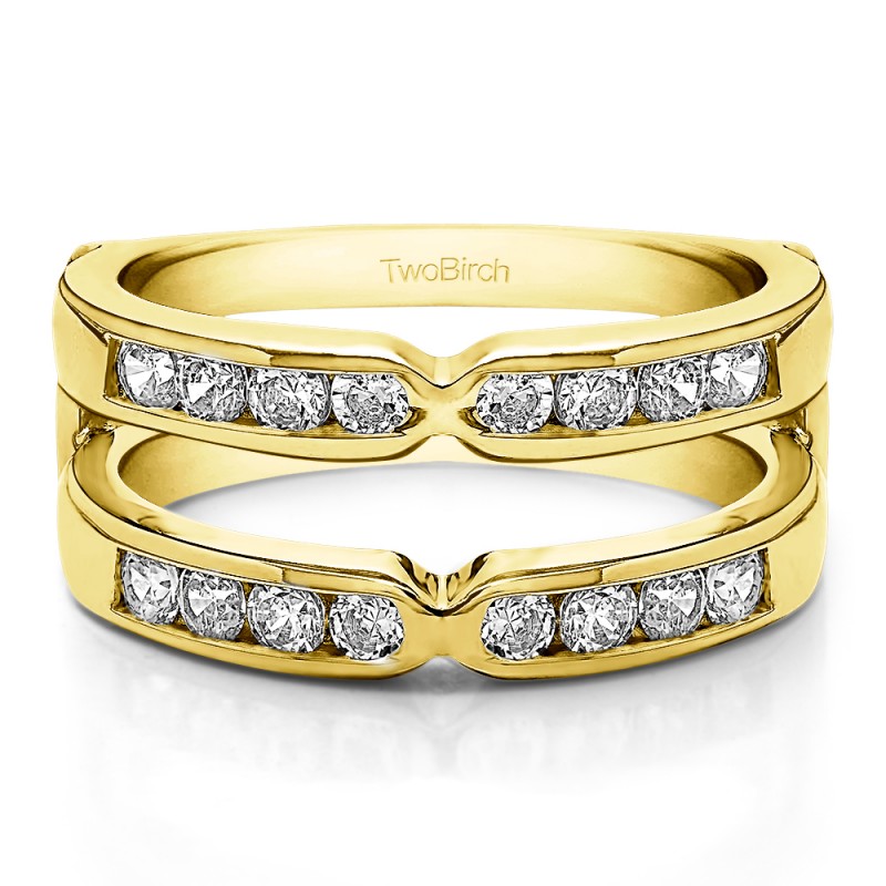 This wedding ring guard has 24 round, channel set stones. Each band measures 1.8 millimeters wide. This ring guard has 0.51 carats total weight. It is made to fit a round solitaire from 0.2 carats to 0.45, or a princess cut solitaire from 0.2 up to 0.75, or a marquise solitaire from 0.25 up to 0.5 carats.