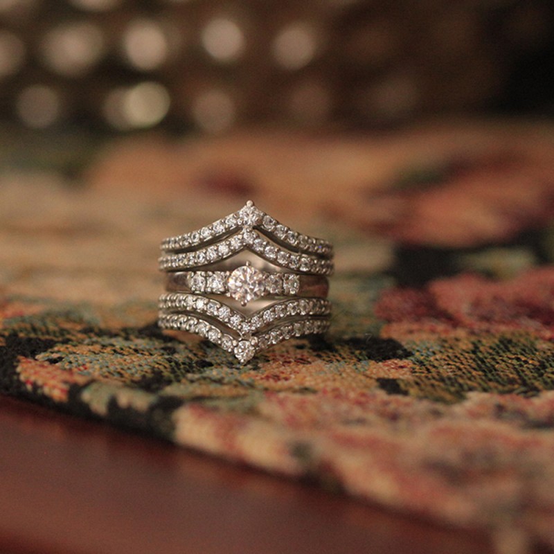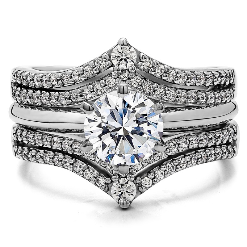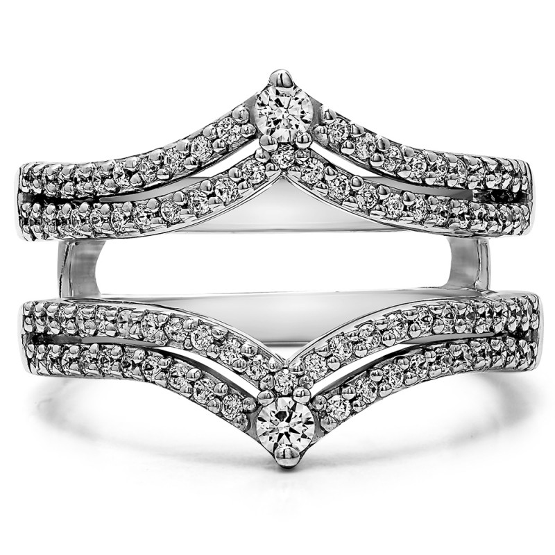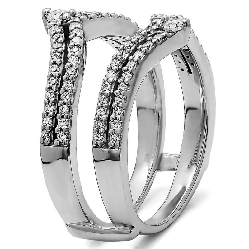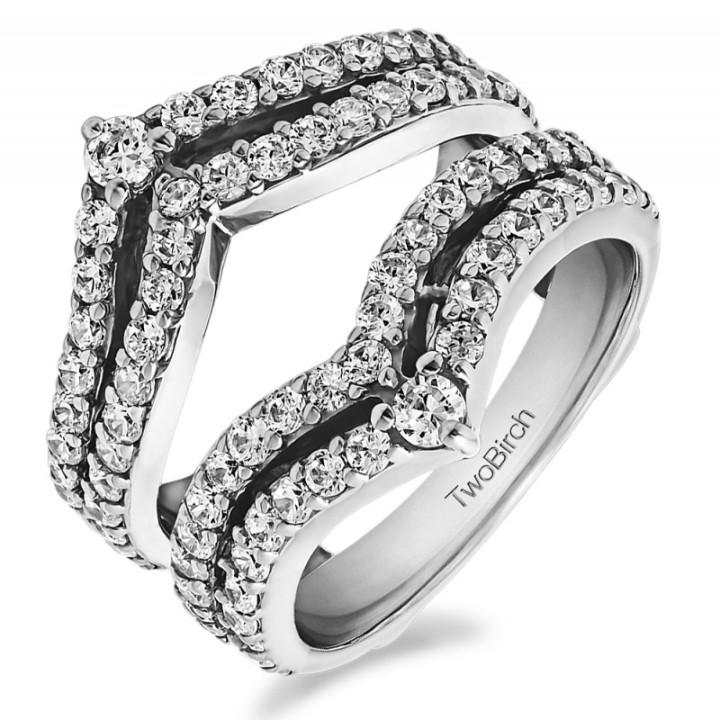 This wedding ring guard has 88 round, prong set stones. Each band measures 2 millimeters wide. This ring guard has 0.53 carats total weight. It is made to fit a round or princess cut solitaire from 0.5 carats to 2 carats.