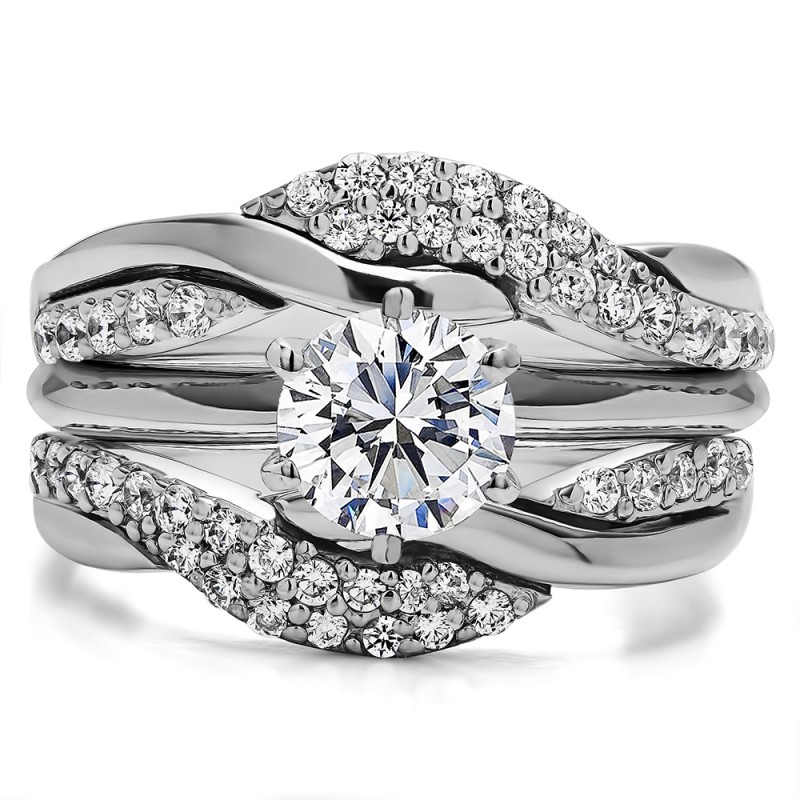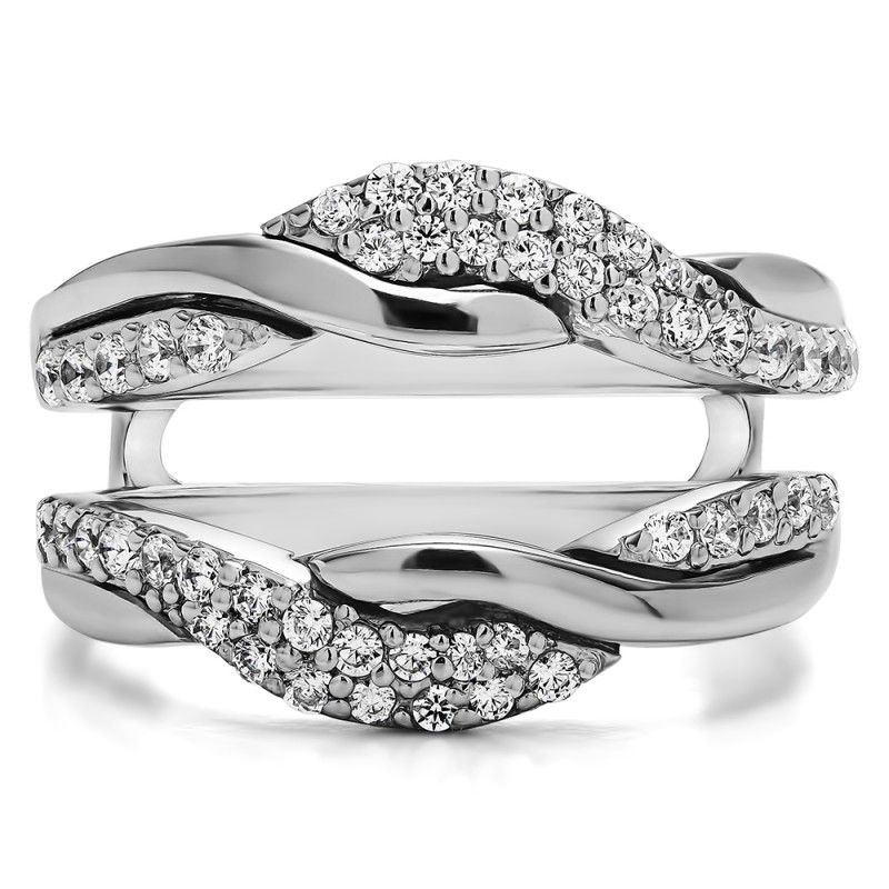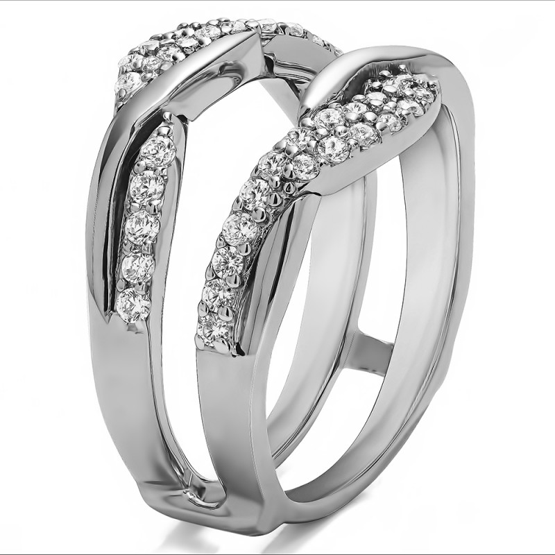 This wedding ring guard has 48 round, prong set stones. Each band measures 2.71 millimeters wide. This ring guard has 0.54 carats total weight. It is made to fit a round or princess cut solitaire from 0.5 carats to 2, or a marquise solitaire from 0.75 up to 1.5 carats.