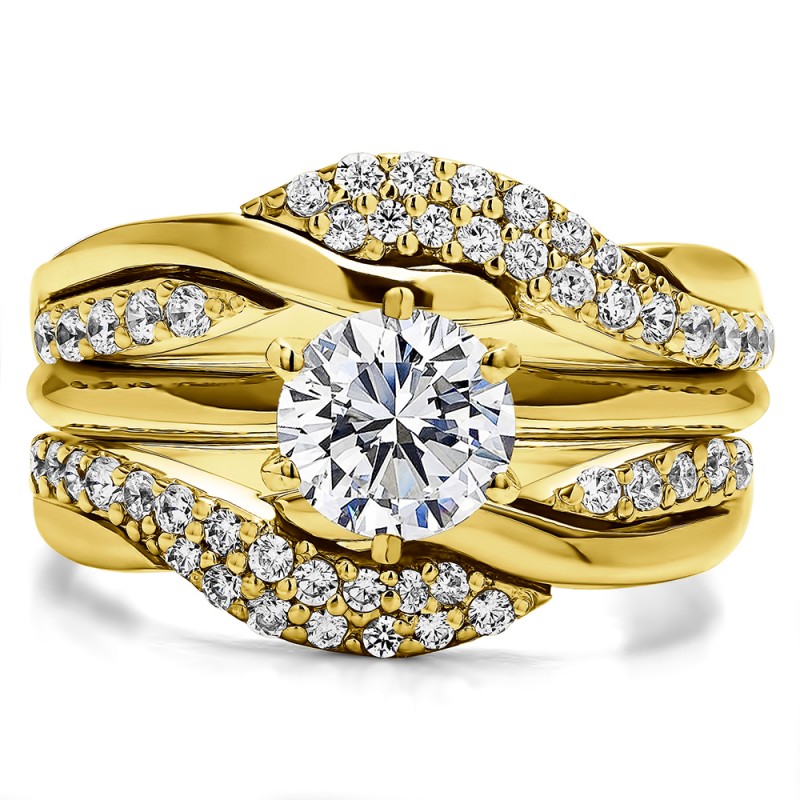 This wedding ring guard has 48 round, prong set stones. Each band measures 2.71 millimeters wide. This ring guard has 0.54 carats total weight. It is made to fit a round or princess cut solitaire from 0.5 carats to 2, or a marquise solitaire from 0.75 up to 1.5 carats.