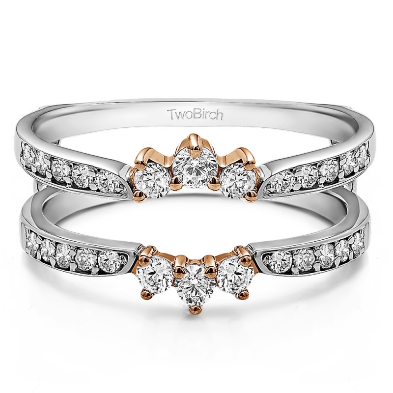This wedding ring guard has 26 round, prong set stones. Each band measures 2.1 millimeters wide. This ring guard has 0.56 carats total weight. It is made to fit a round solitaire from 0.25 carats to 1.75, or a princess cut solitaire from 0.25 up to 2, or a marquise solitaire from 0.25 up to 0.5 carats.