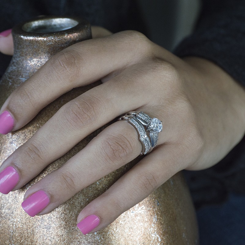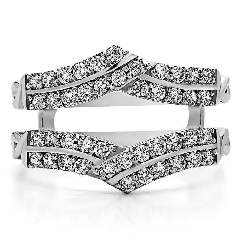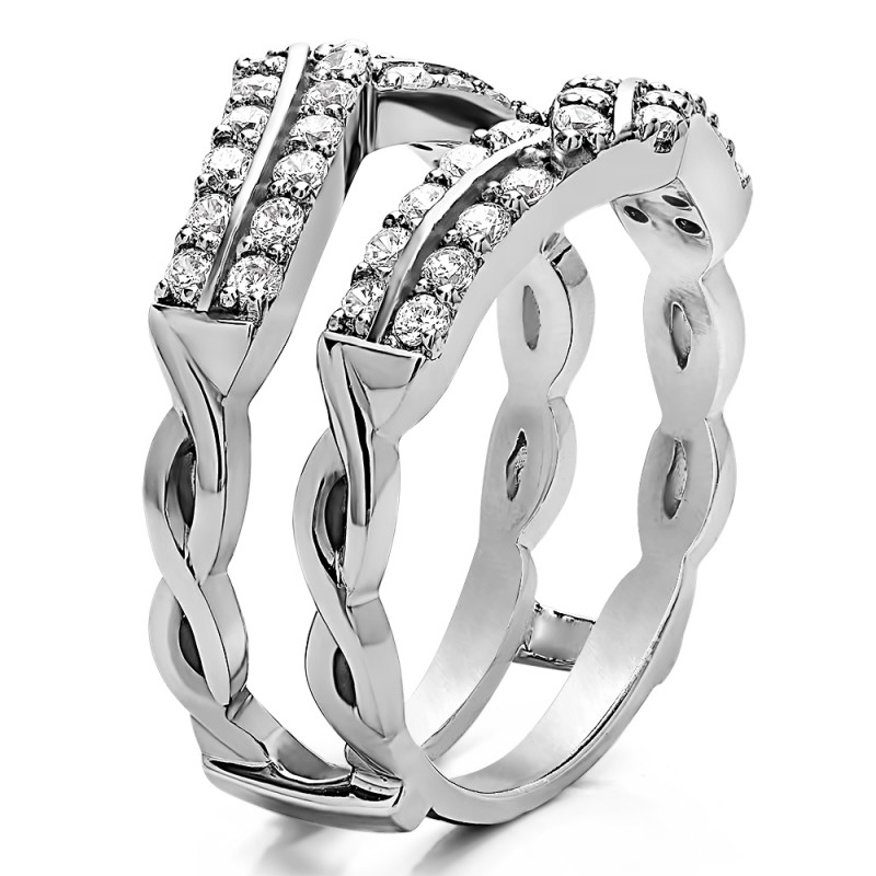 This wedding ring guard has 44 round, prong set stones. Each band measures 2.16 millimeters wide. This ring guard has 0.66 carats total weight. It is made to fit a round or princess cut solitaire from 0.5 carats to 2, or a marquise solitaire from 0.5 up to 1.5 carats.