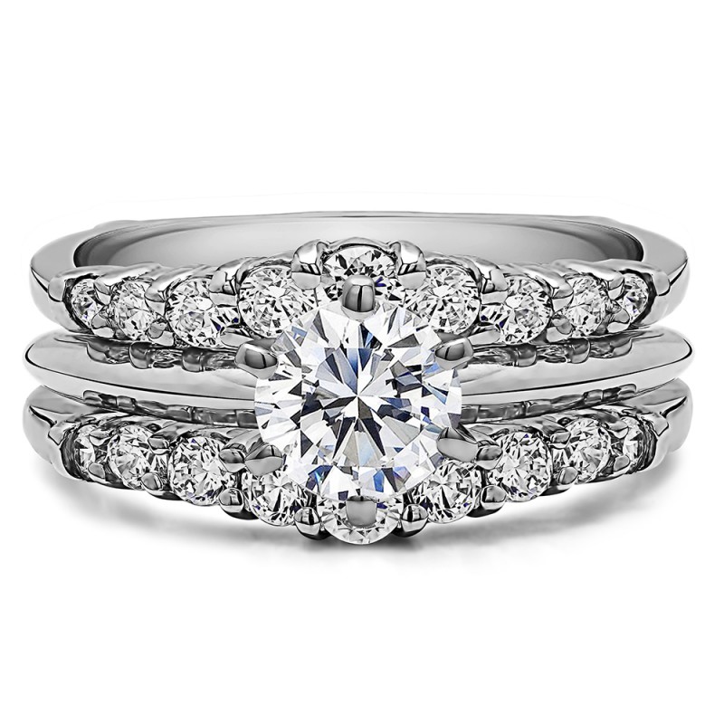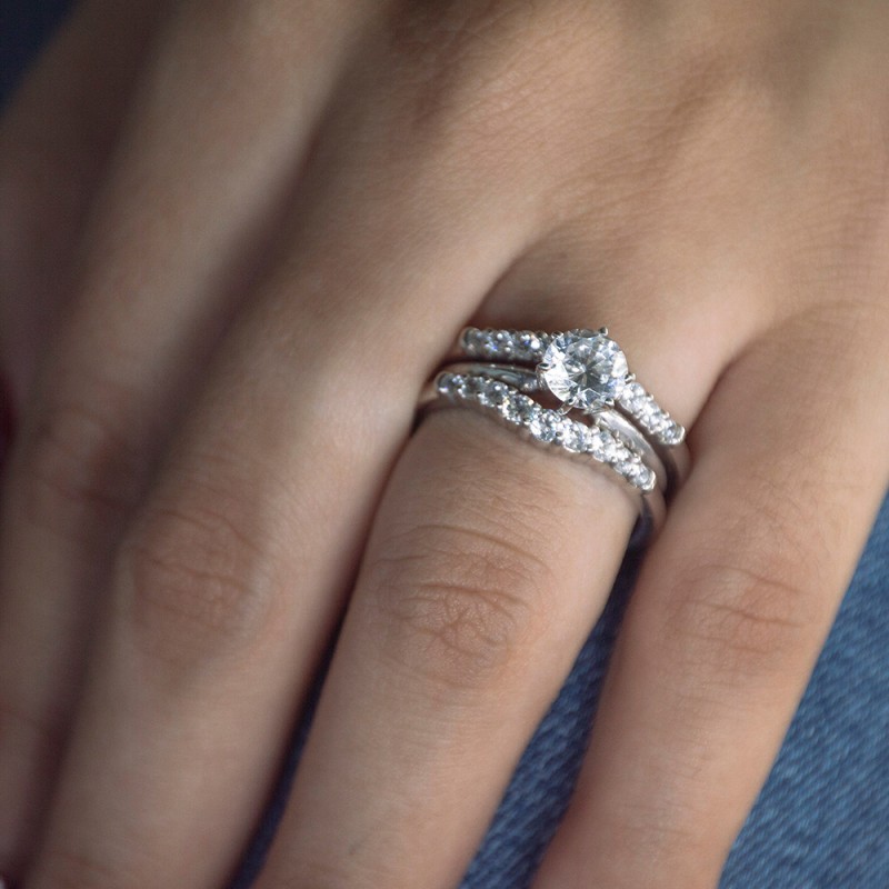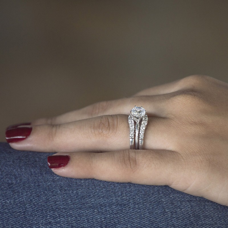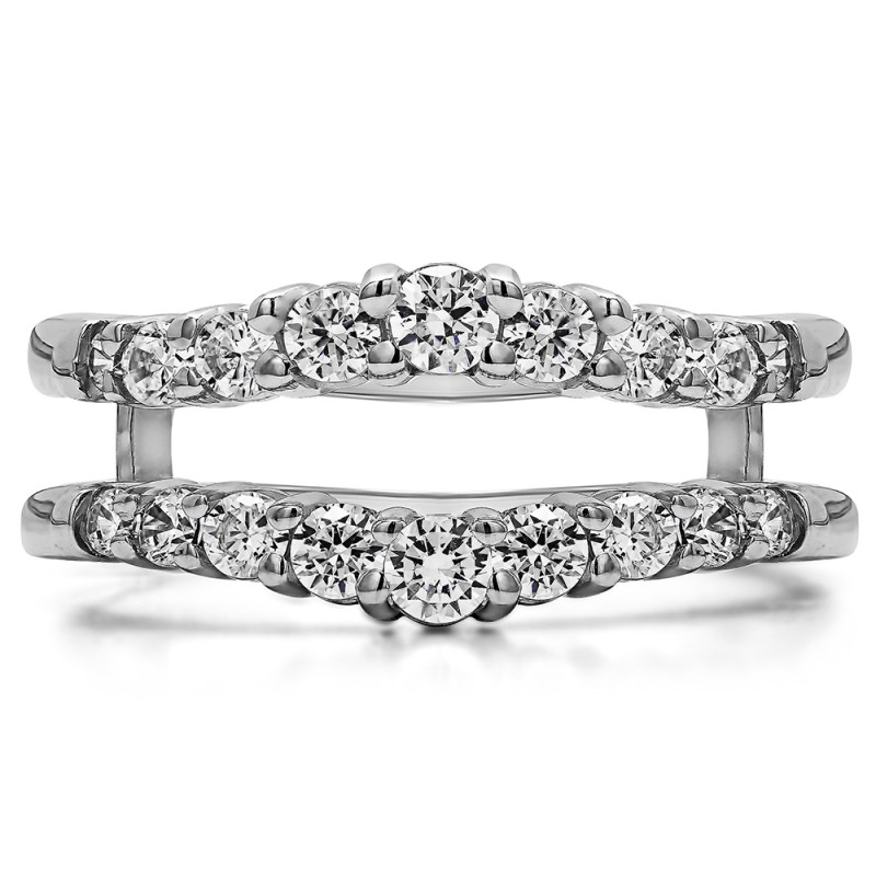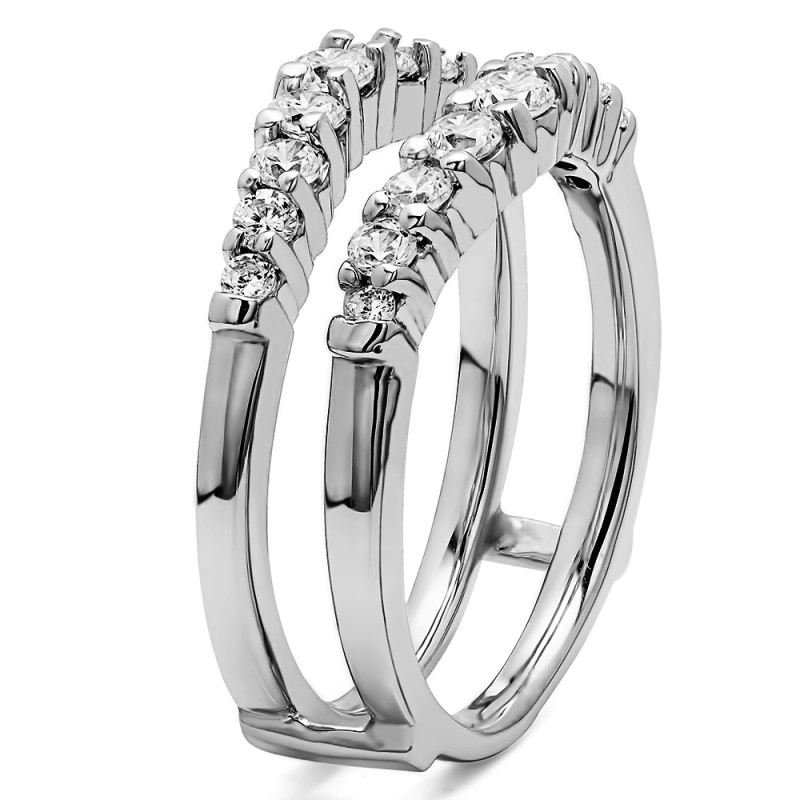This wedding ring guard has 18 round, prong set stones. Each band measures 2.5 millimeters wide. This ring guard has 0.71 carats total weight. It is made to fit a round or princess cut solitaire from 0.2 carats to 2 carats.