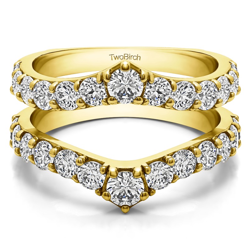 This wedding ring guard has 34 round, prong set stones. Each band measures 2 millimeters wide. This ring guard has 0.74 carats total weight. It is made to fit a round solitaire from 0.25 carats to 1 carats.