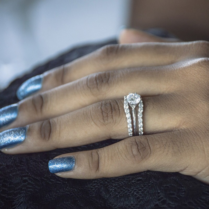 This wedding ring guard has 26 round, prong set stones. Each band measures 1.7 millimeters wide. This ring guard has 1.01 carats total weight. It is made to fit a round solitaire from 0.25 carats to 2, or a princess cut solitaire from 0.25 up to 0.5 carats.