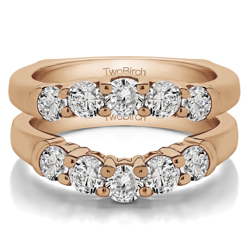 This wedding ring guard has 10 round, prong set stones. Each band measures 2.62 millimeters wide. This ring guard has 1.48 carats total weight. It is made to fit a round or princess cut solitaire from 0.5 carats to 2, or a marquise solitaire from 0.5 up to 1.5 carats.