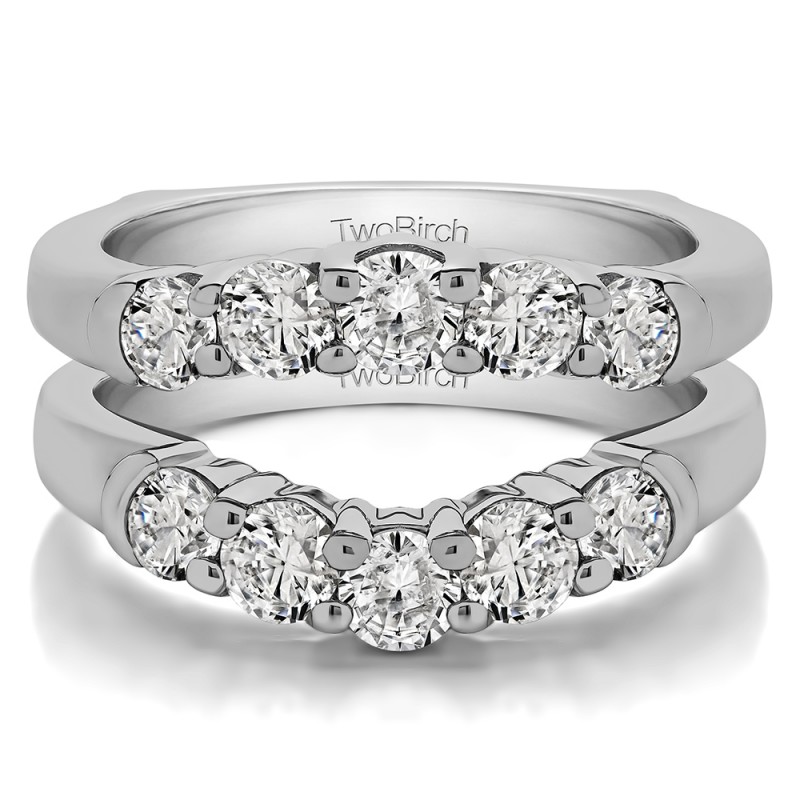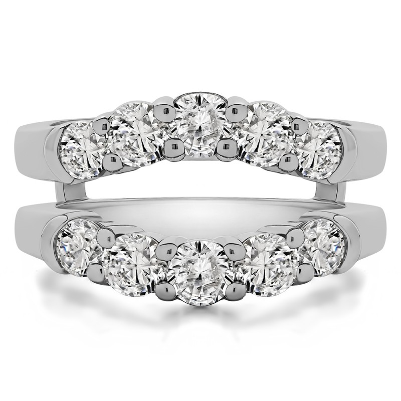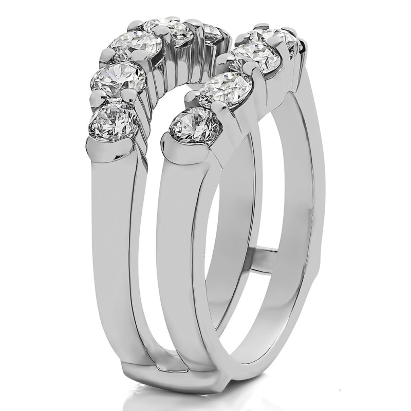 This wedding ring guard has 10 round, prong set stones. Each band measures 2.62 millimeters wide. This ring guard has 1.48 carats total weight. It is made to fit a round or princess cut solitaire from 0.5 carats to 2, or a marquise solitaire from 0.5 up to 1.5 carats.