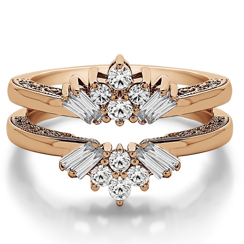 This wedding ring guard has 16 round, prong set stones. Each band measures 1.89 millimeters wide. This ring guard has 0.64 carats total weight. It is made to fit a round solitaire from 0.25 carats to 1, or a princess cut solitaire from 0.5 up to 2 carats.