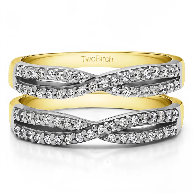 This wedding ring guard has 68 round, prong set stones. Each band measures 2.13 millimeters wide. This ring guard has 0.48 carats total weight. It is made to fit a round solitaire from 0.25 carats to 2, or a princess cut solitaire from 0.25 up to 1.5, or a marquise solitaire from 0.5 up to 1.5 carats.