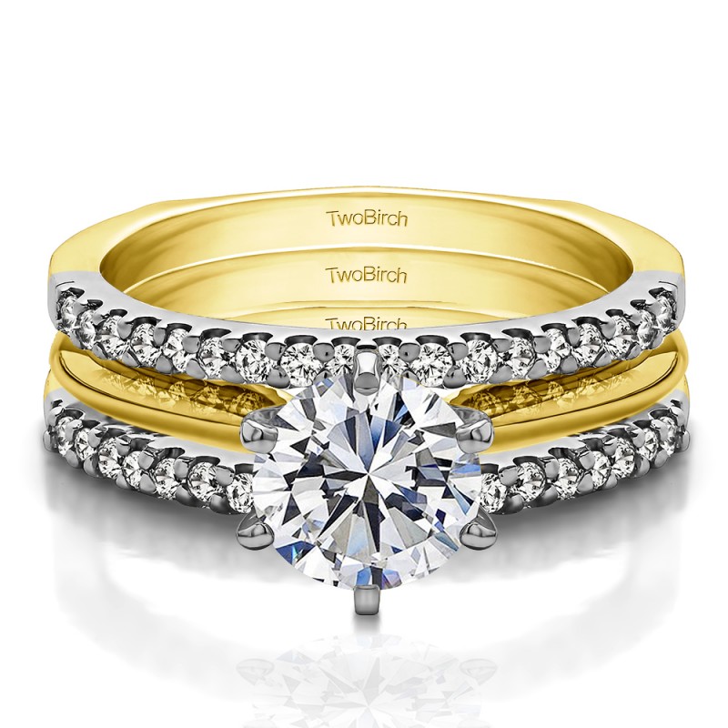This wedding ring guard has 36 round, prong set stones. Each band measures 1.72 millimeters wide. This ring guard has 0.36 carats total weight. It is made to fit a round or princess cut solitaire from 0.25 carats to 2 carats.