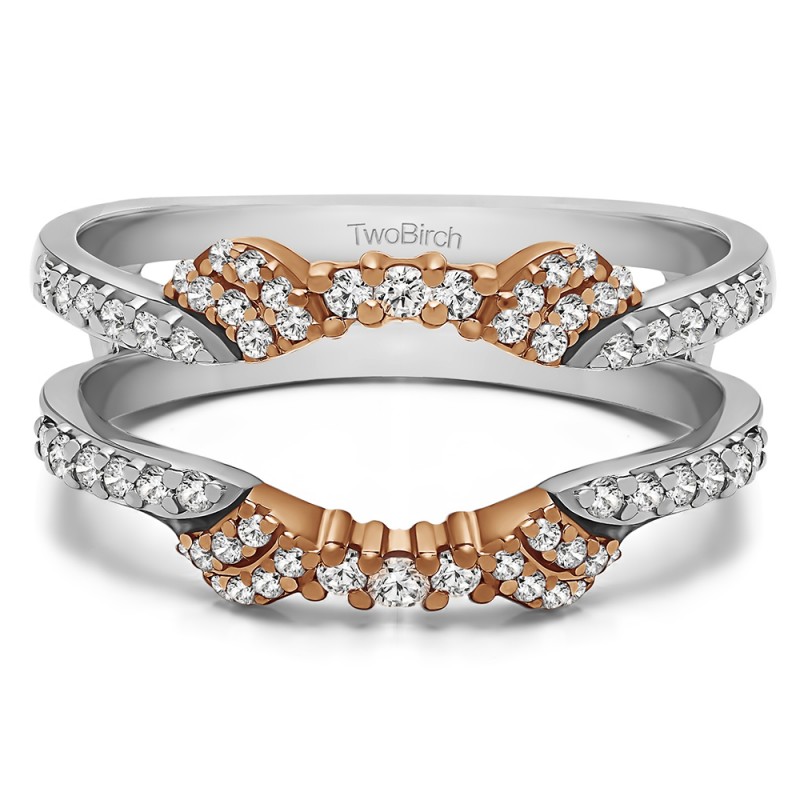 This wedding ring guard has 62 round, prong set stones. Each band measures 1.85 millimeters wide. This ring guard has 0.47 carats total weight. It is made to fit a round solitaire from 0.5 carats to 2, or a princess cut solitaire from 0.25 up to 1.5, or a marquise solitaire from 0.5 up to 1.5 carats.