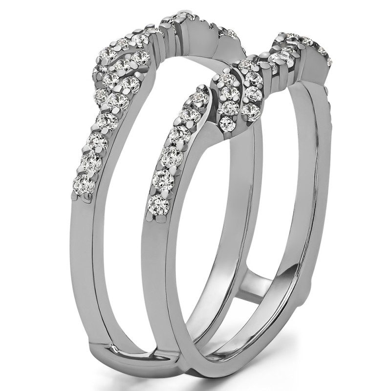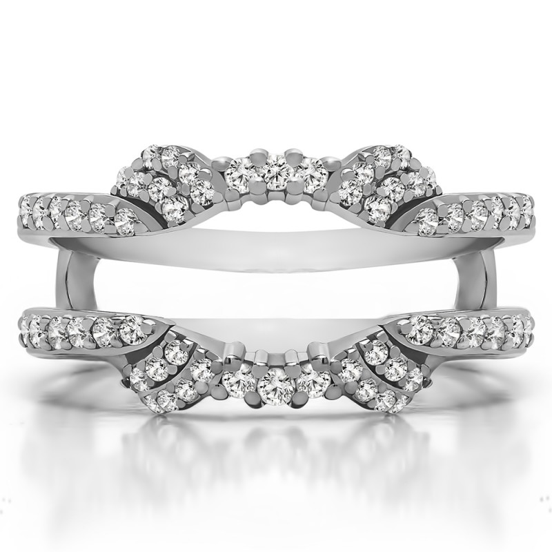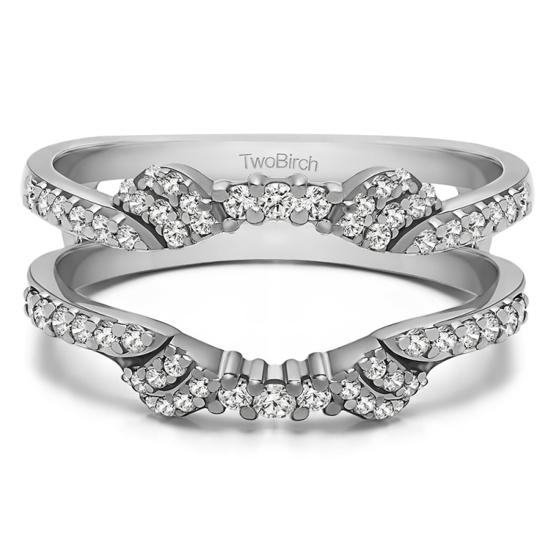 This wedding ring guard has 62 round, prong set stones. Each band measures 1.85 millimeters wide. This ring guard has 0.47 carats total weight. It is made to fit a round solitaire from 0.5 carats to 2, or a princess cut solitaire from 0.25 up to 1.5, or a marquise solitaire from 0.5 up to 1.5 carats.