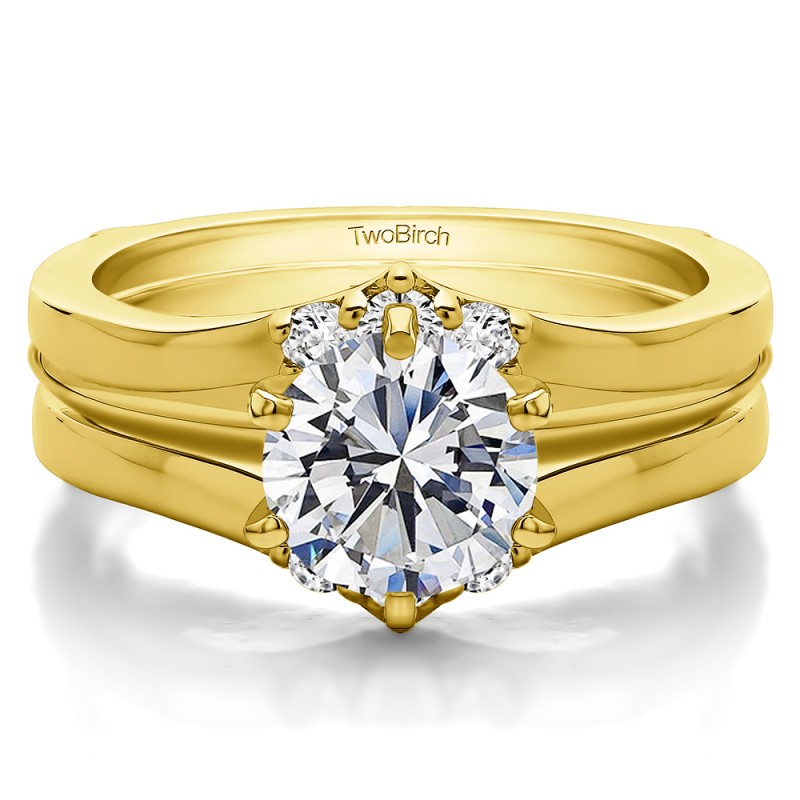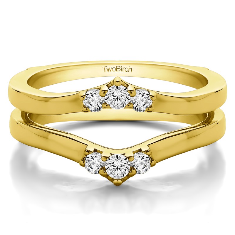This wedding ring guard has 6 round, prong set stones. Each band measures 1.75 millimeters wide. This ring guard has 0.2 carats total weight. It is made to fit a round or princess cut solitaire from 0.5 carats to 2, or a marquise solitaire from 0.5 up to 1.25 carats.